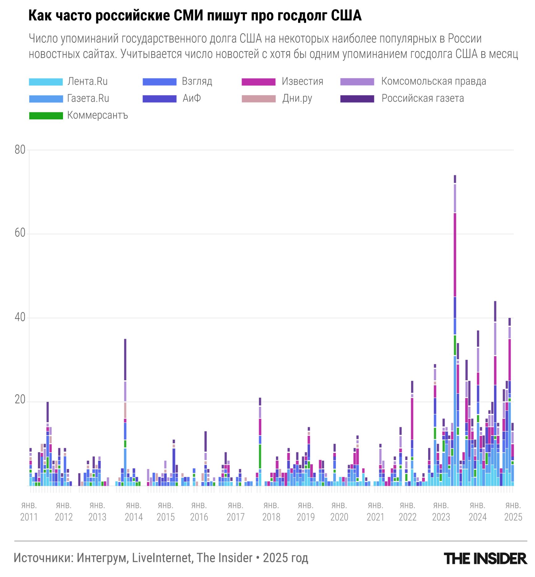 В российских СМИ страшилка об американском госдолге стала намного популярнее после вторжения в Украину, свидетельствует анализ The Insider. Сам же Маск на эту, как и на многие другие темы, до конца 2024 года вообще не высказывался. Теперь же национальному долгу посвящена немалая часть его постов в Х. С начала 2025 года он написал об этом как минимум 140 раз — больше, чем за весь прошедший год (а еще раньше тема госдолга и растраты бюджета США его не интересовала вовсе).