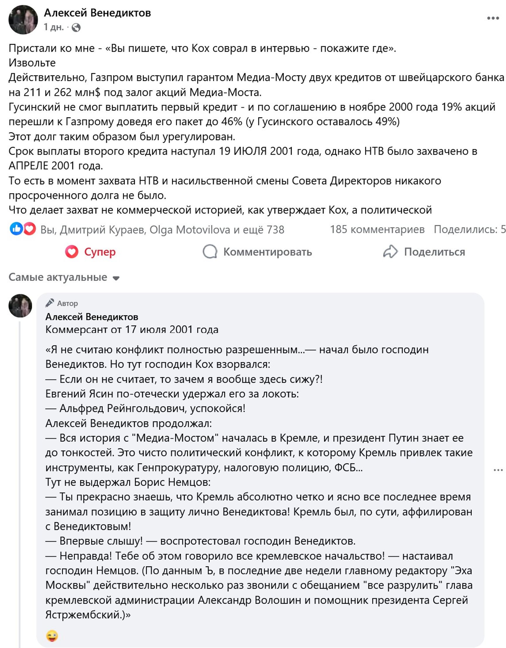 На это заявление обратил внимание бывший главный редактор «Эха Москвы» Алексей Венедиктов, написав в Facebook: