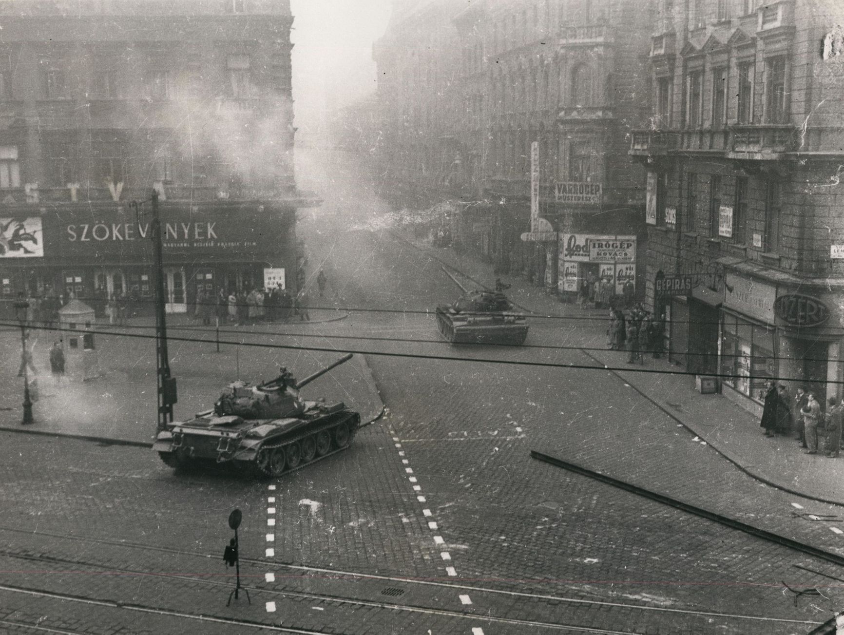 Незадолго до полуночи мы услышали грохот советских танков, некоторые из них проехали мимо нашего дома в направлении проспекта Андраши. Там они скопились и собирались разбить лагерь на ночь. Тысячи борцов за свободу стихийно двинулись в атаку еще до рассвета. Эта атака закончилась одним из самых тяжелых боев. Я наблюдал за ним из своего окна. Было уничтожено более 30 машин. И после этого советские танки больше не оставались на ночь в центре города. Каждый вечер, до полуночи, они уходили, чтобы вернуться на рассвете.