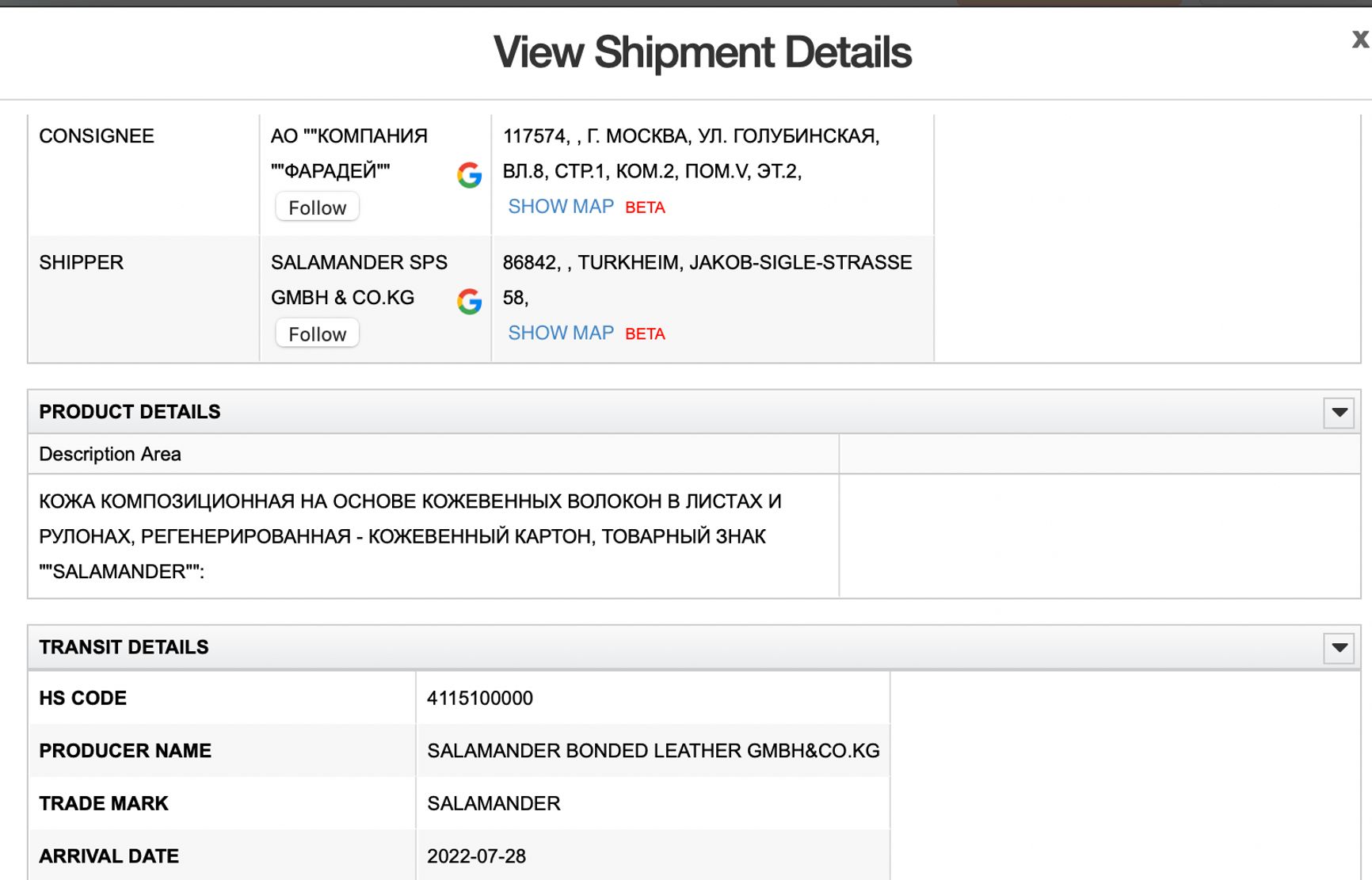 «Производственные мощности компании — это новейшее высококачественное немецкое оборудование», — с гордостью сообщает «Донобувь» в своем каталоге. Как выяснил The Insider, «Донобувь» поставляет из Германии также обувной клей (отправитель — Jakob KECK Chemie GmbH) и кожу (Salamander SPS GmbH & Co. KG), а подошвы импортирует из Италии (Tacchificio Campliglionese).