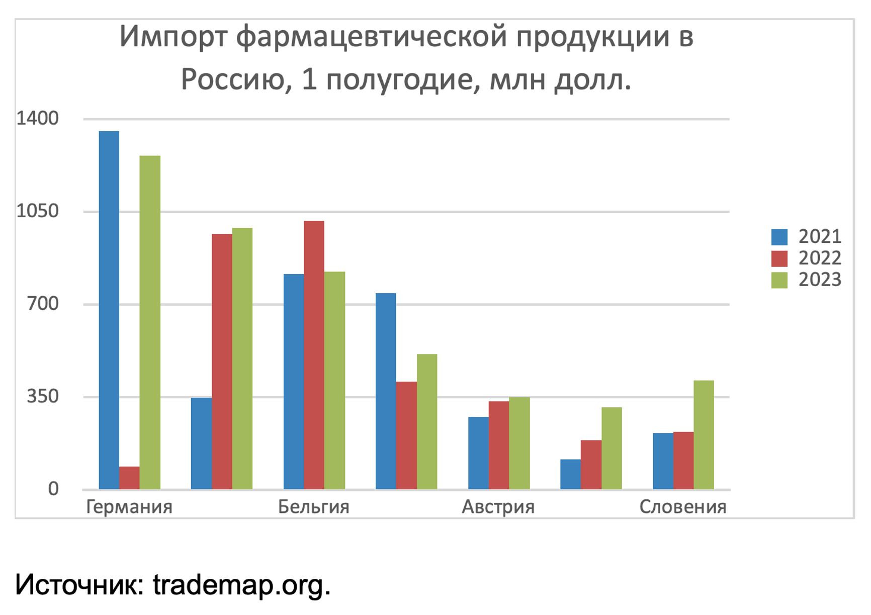 В отношении фармацевтической продукции расклад не такой, как с другими категориями импорта. Здесь крупнейшими поставщиками России даже в 2022 году оставались западные соседи: Германия (23%), Бельгия (15%), Швейцария (14%), Нидерланды (5,9%), Словения и Австрия (по 4,7%). Объем ввоза лекарств из Европы даже продолжал расти. Поступления лекарств с других направлений незначительны: из Индии чуть больше 3%, из Китая чуть меньше 2%, из Южной Кореи 0,5%. И даже в 2023 году ничего принципиально не изменилось: вся первая десятка стран по экспорту фармацевтической продукции в Россию находится в Западной Европе. Показательно, что применительно к импорту западноевропейских медикаментов в Россию логика «водяного перемирия» преобладает над санкциями и бойкотами. Обе стороны, похоже, считают, что все-таки неправильно оставлять российских больных без европейских лекарств.