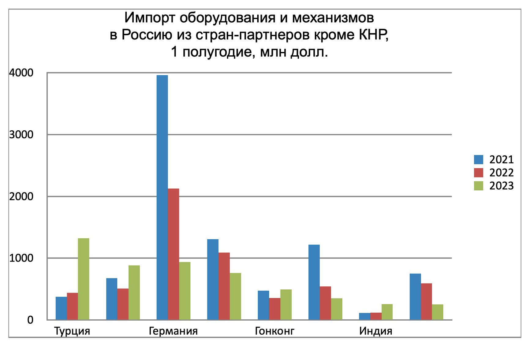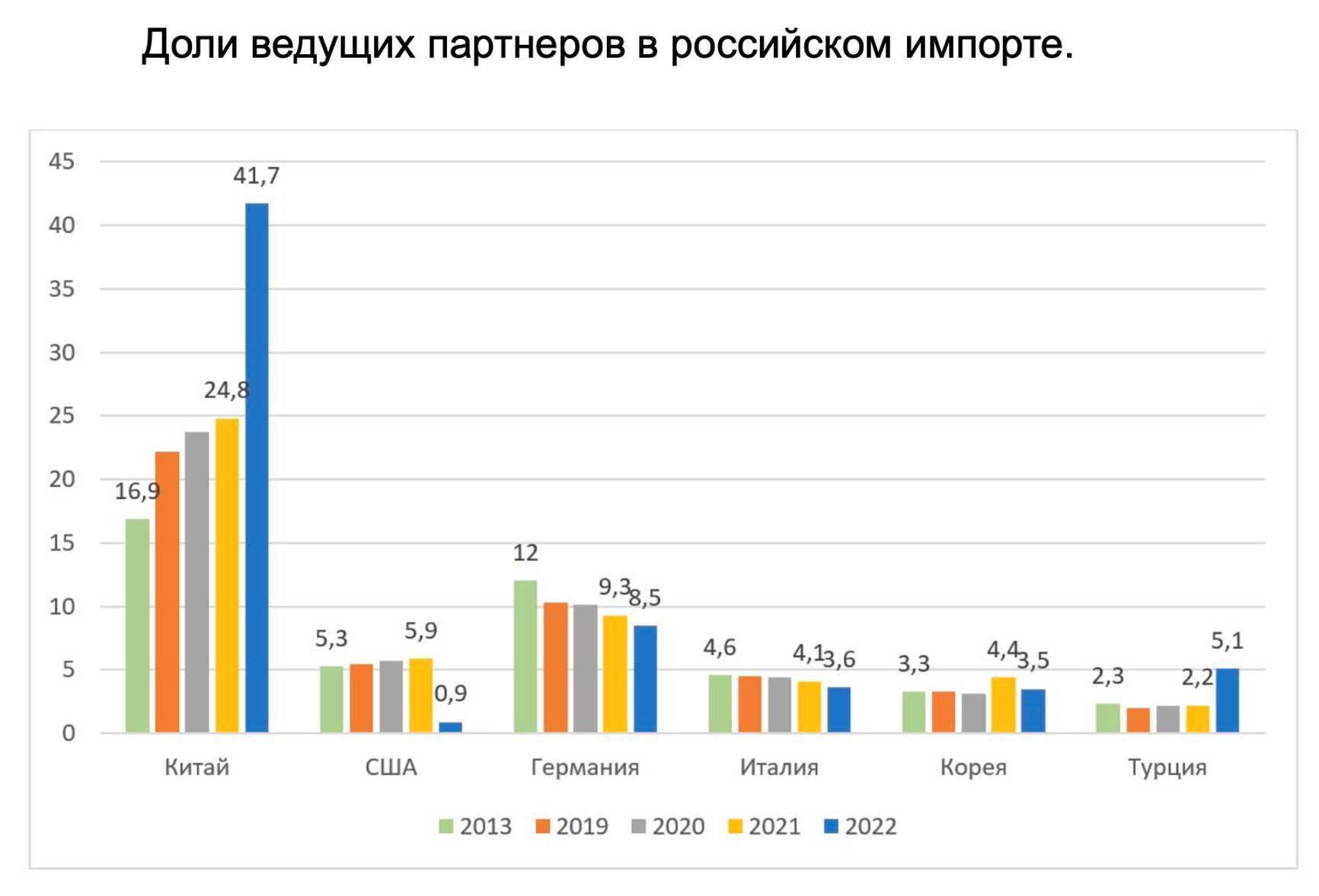За 2023 год цифр по Китаю еще нет, поэтому доли разных стран в общем импорте вычислить нельзя. Зато известно, что импорт из Германии продолжил сокращаться. В IV квартале 2022 года он уже был меньше турецкого, а со II квартала 2023-го уже меньше и южнокорейского, который остается примерно на довоенном уровне. Быстро падают поставки и из Польши, Японии, Италии.