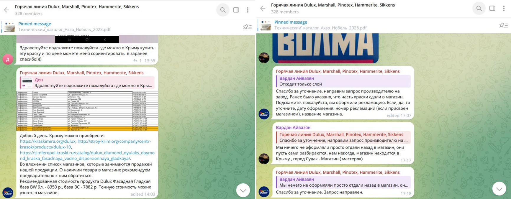 Комментарии в чате официального канала AkzoNobel, включая ответы представителя компании, позволяют предположить, что производитель осведомлен о продаже своих красок на оккупированной территории. Так, в ответ на запрос по краске официальный аккаунт «горячей линии по краскам Dulux, Marshall, Pinotex, Hammerite, Sikkens» рекомендует три сети крымских магазинов с продукцией AkzoNobel: kraskimira.org, stroy-krim.org и simferopol.kraski.ru.