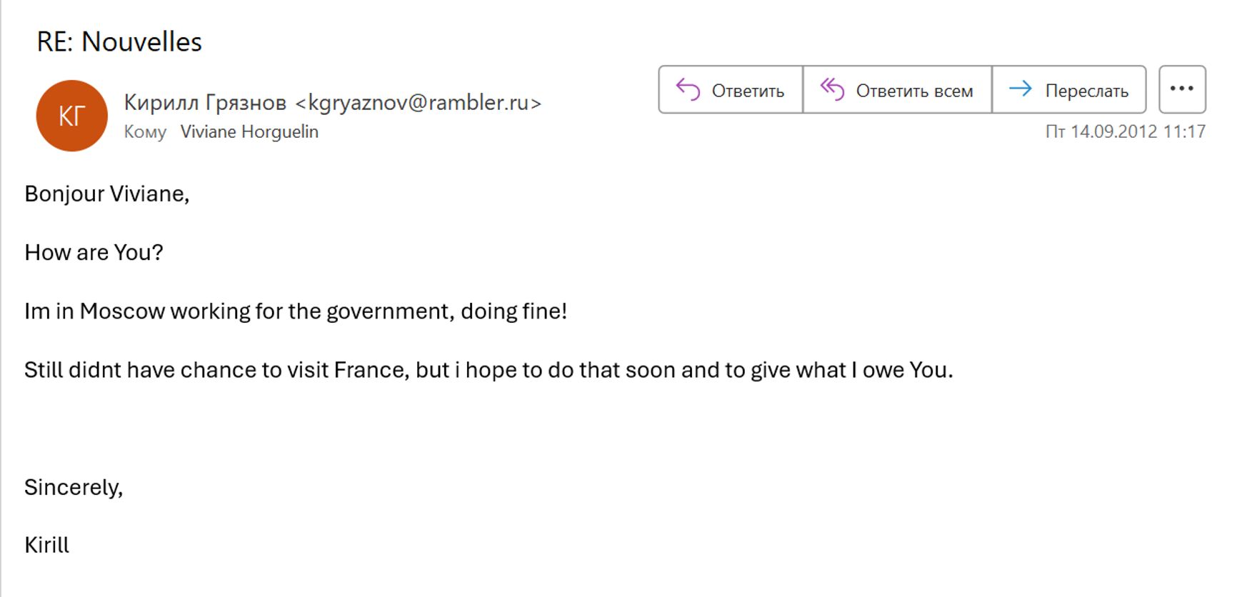 Интересно, что Кирилл Грязнов не особенно скрывал, что является не просто поваром. Так, например, в 2012 году он писал хозяйке своей квартиры во Франции: «у меня все хорошо, я в Москве, работаю на государство!» - хотя нет никаких данных, чтобы он работал в каких-либо государственных компаниях или организациях.