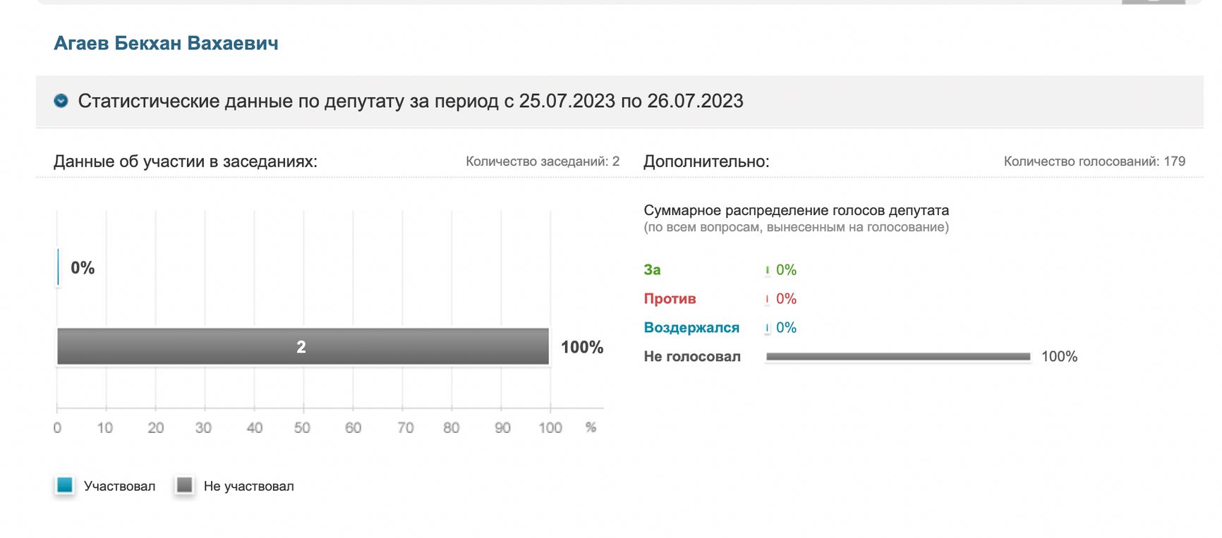 В конце июля 2023 года Госдума завершала очередную сессию. Согласно результатам голосований, член «Единой России» Бекхан Агаев, хоть и продолжал публиковать новости в своем Telegram-канале, ни по одному вопросу 25 и 26 июля не голосовал.