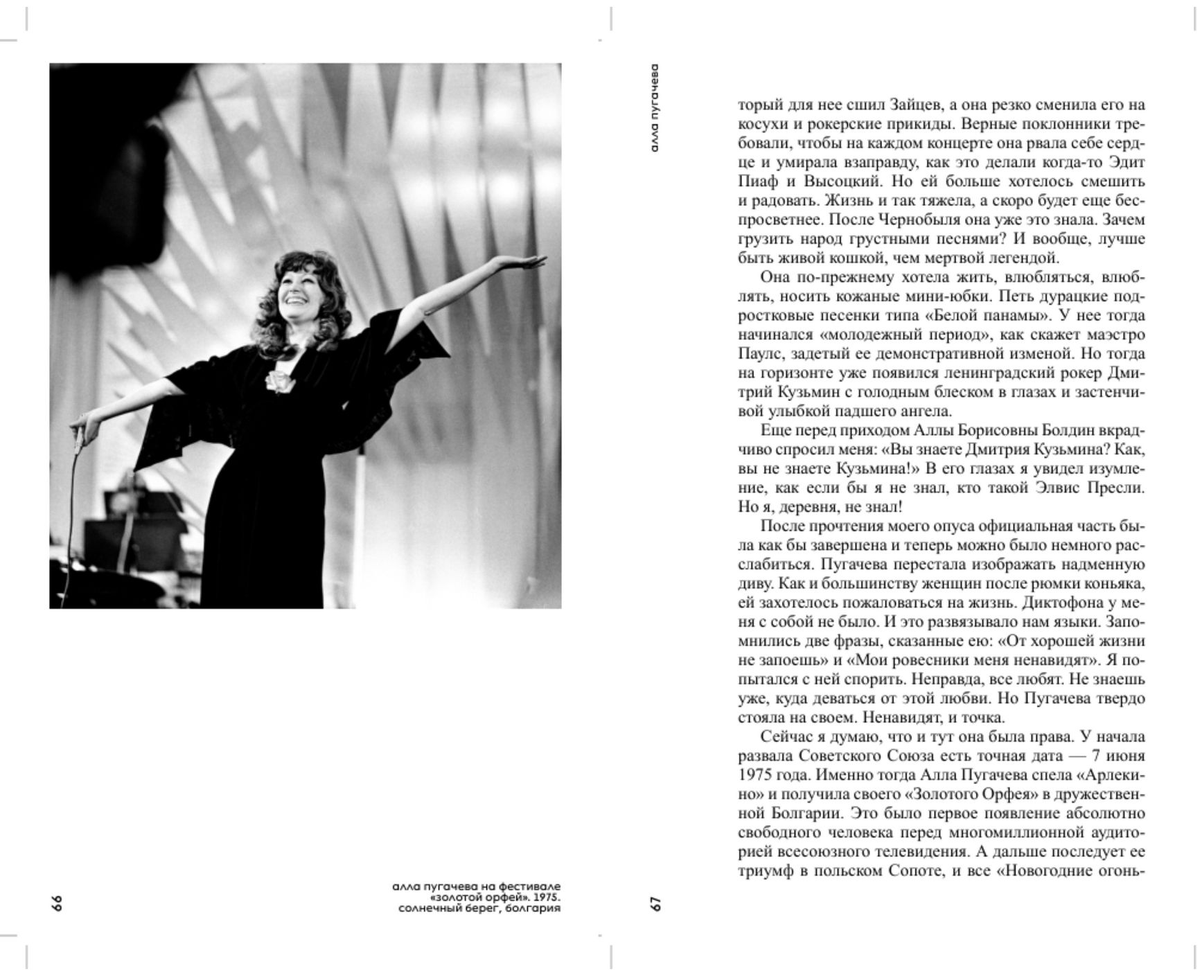 […] Пятнадцать лет назад она объявила о своем уходе со сцены. Наверное, первый раз в жизни она решила послушаться мужчины. В свое время Муслим Магомаев, кумир юности, ей присоветовал: как исполнится шестьдесят, закрывай лавочку. Кроме всего прочего, Пугачева хотела показать пример всем именитым соотечественникам, намертво вросшим в свои кресла, в должности, в роли, что возможны и другие варианты судьбы. «Концерт уже окончен, но песня бесконечна». Ей, конечно, поаплодировали, но про себя покрутили пальцем у виска, по своей привычке заподозрив в актерских штучках: от таких денег и славы добровольно не отказываются!