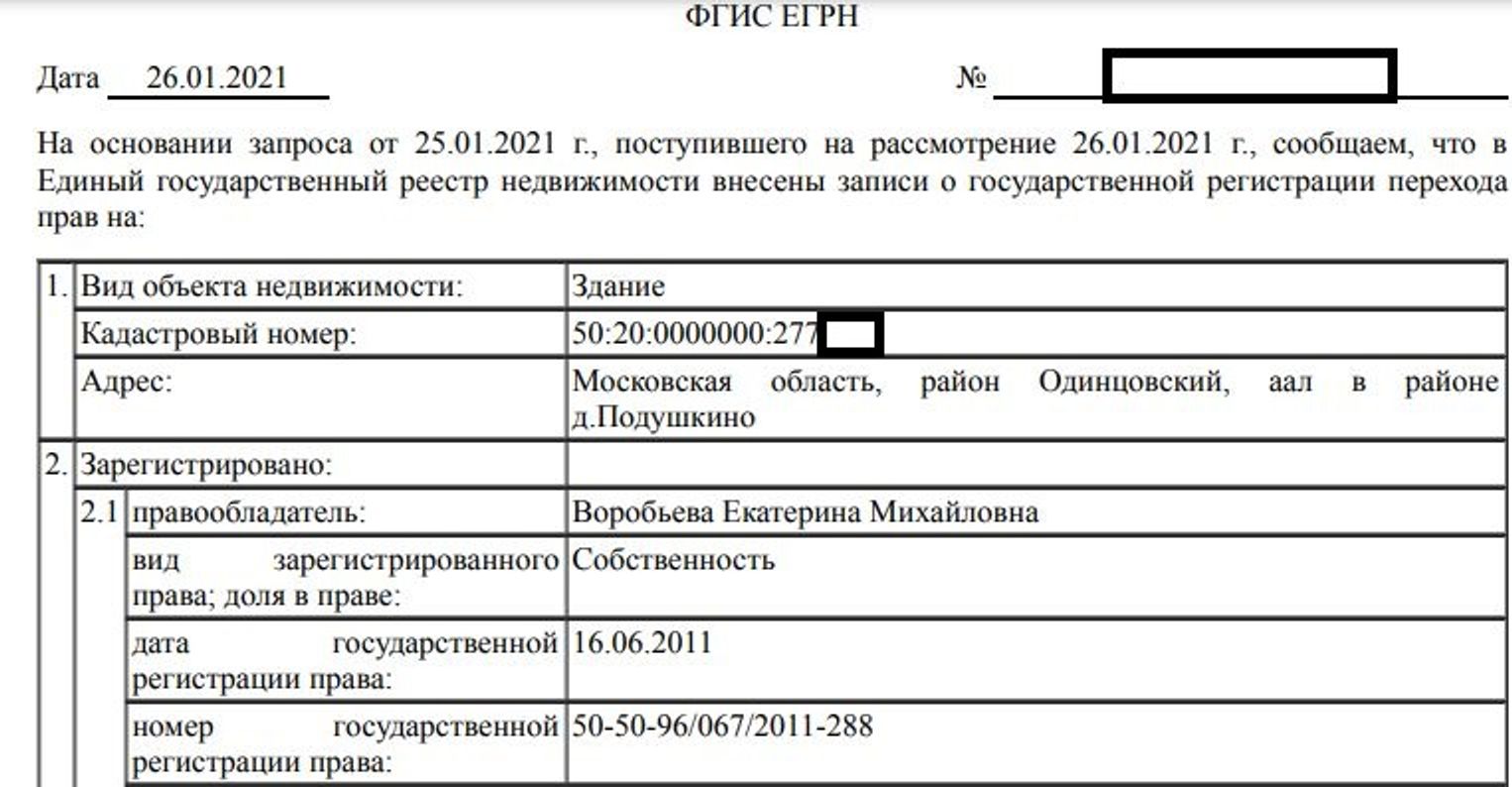 The Insider выяснил, что дом в Подушкино зарегистрирован на 32-летнюю дочь Воробьевых Екатерину. Площадь трехэтажного здания — 350 м².