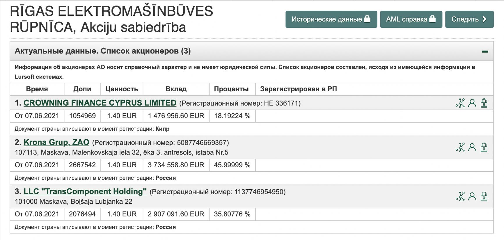 Согласно данным латвийского коммерческого реестра, 36% акций RER по состоянию на 2021 год контролировало российское юрлицо «Холдинг ТрансКомпонент» (LLC «TransComponent Holding»). В данных реестра Латвии указан старый адрес московской компании на Большой Лубянке, но в прошлом году она переехала в Тверь.