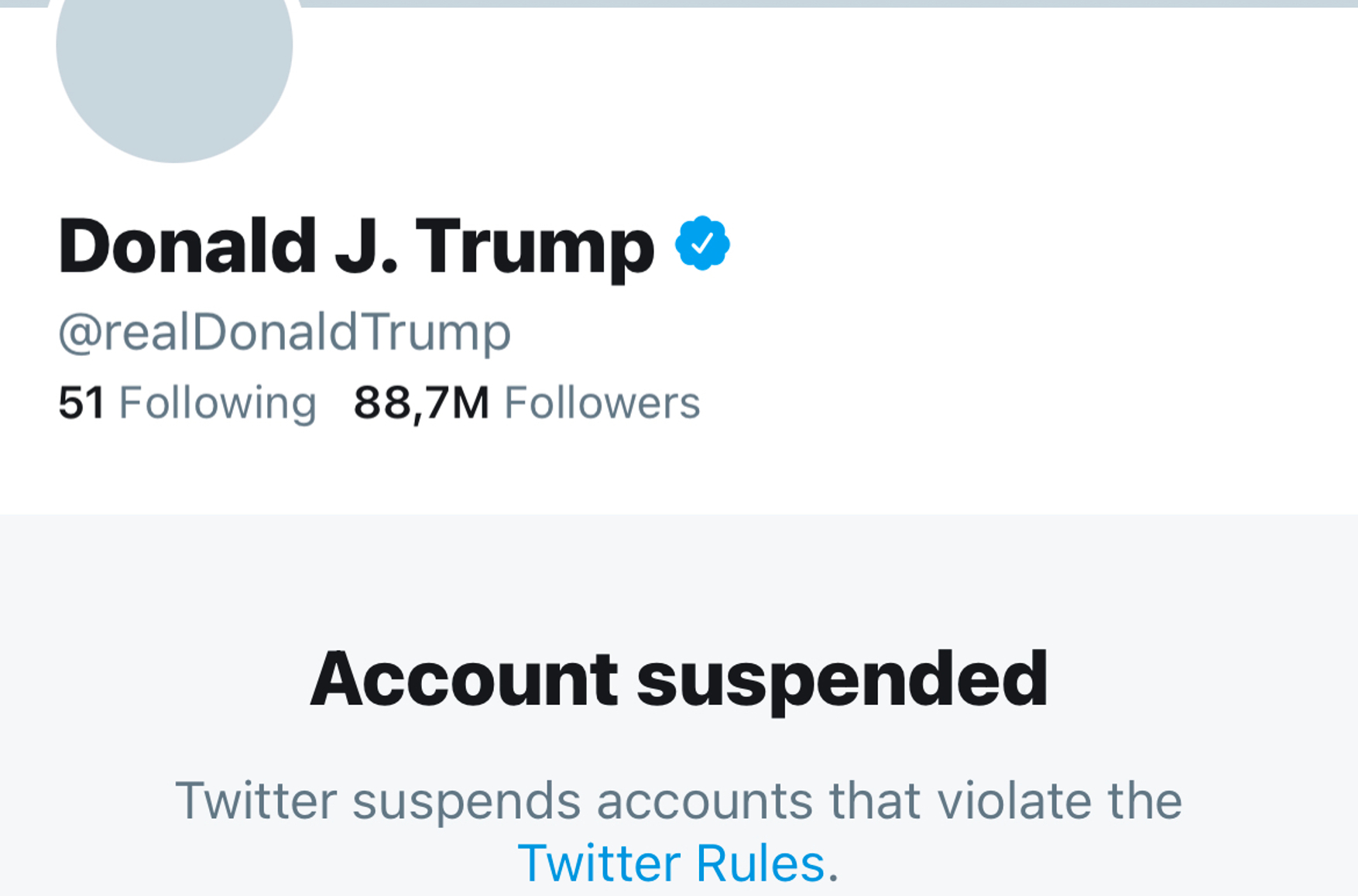 Личный аккаунт Дональда Трампа заблокирован после серии его твитов, которым предшествовала временная блокировка. После захвата сторонниками Трампа Капитолия, уходящий президент был забанен на 12 часов. Теперь в своём корпоративном блоге Twitter сообщает о бессрочной блокировке аккаунта Дональда Трампа с 88 млн подписчиков.