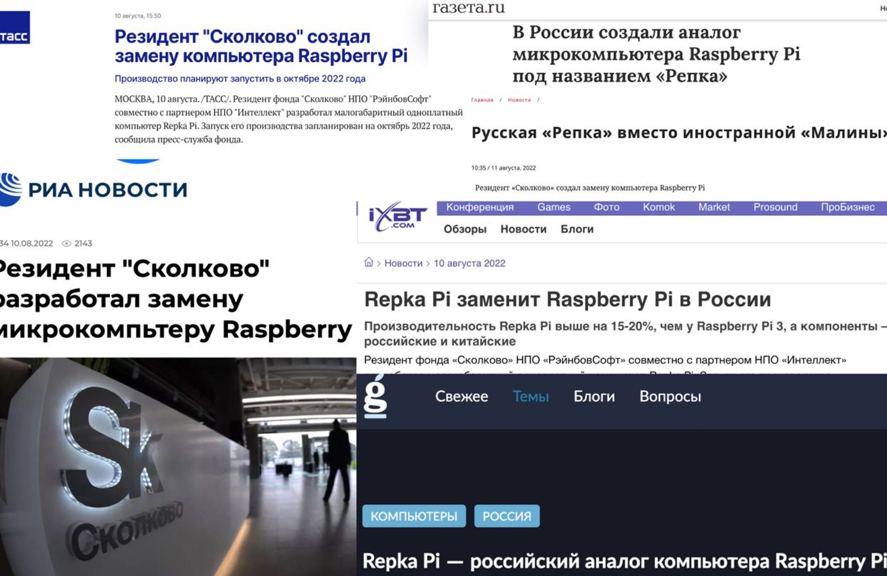 Российские СМИ опубликовали торжественную новость о том, что в Сколково разработали отечественный аналог одноплатного компьютера Raspberry Pi. Выяснилось, что это полная копия китайского одноплатника, который продается на AliExpress. Резидент Сколково, который изобрел «инновацию», также возглавляет ООО «Содействие правоохранительным органам».
