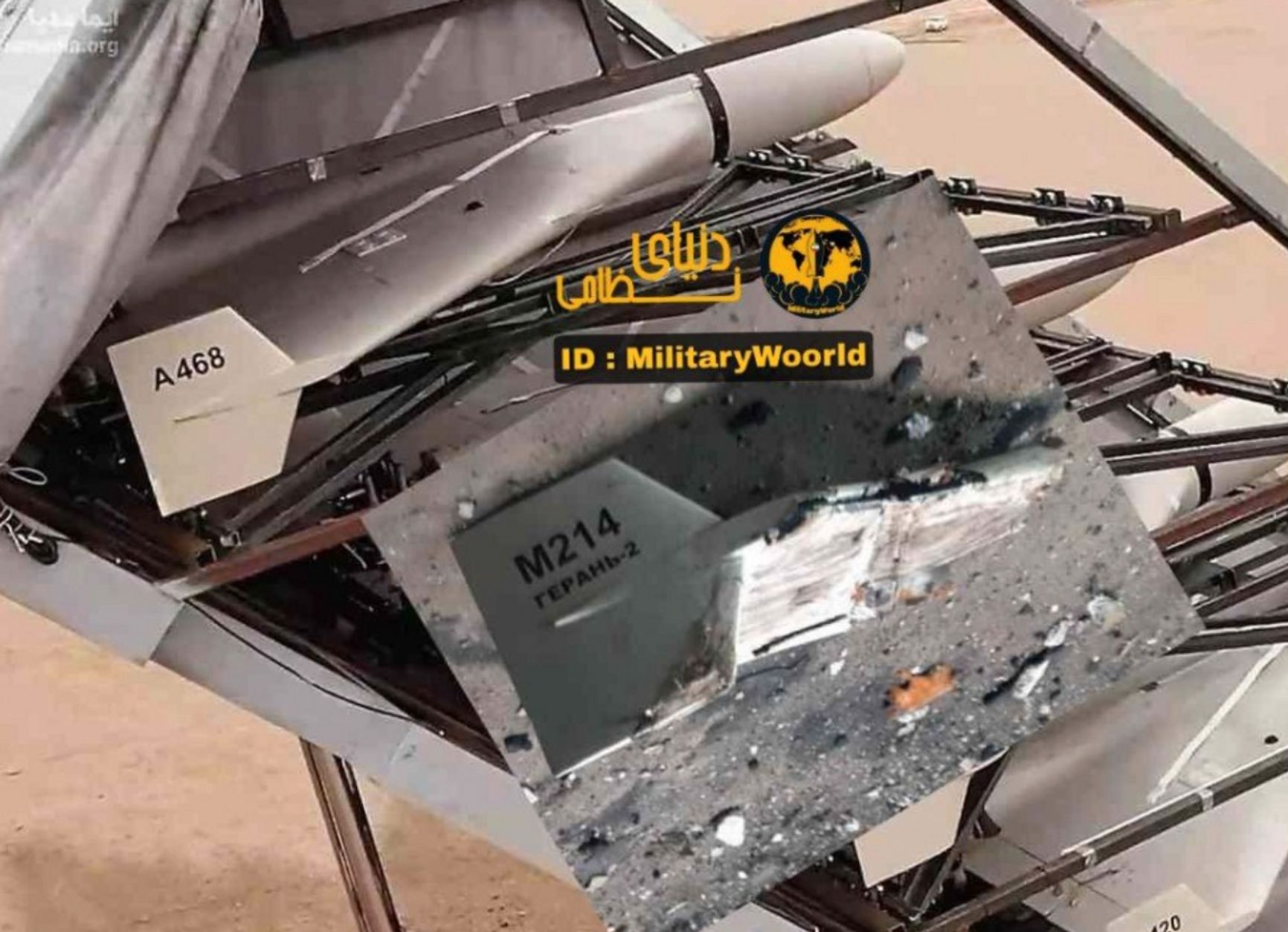 Журналист пишет, что ВС России пытались замаскировать дрон-камикадзе, написав на нем название на русском языке «М214 „Герань-2“». Однако форма обломков и детали указывают на то, что это иранский Shahed-136.
