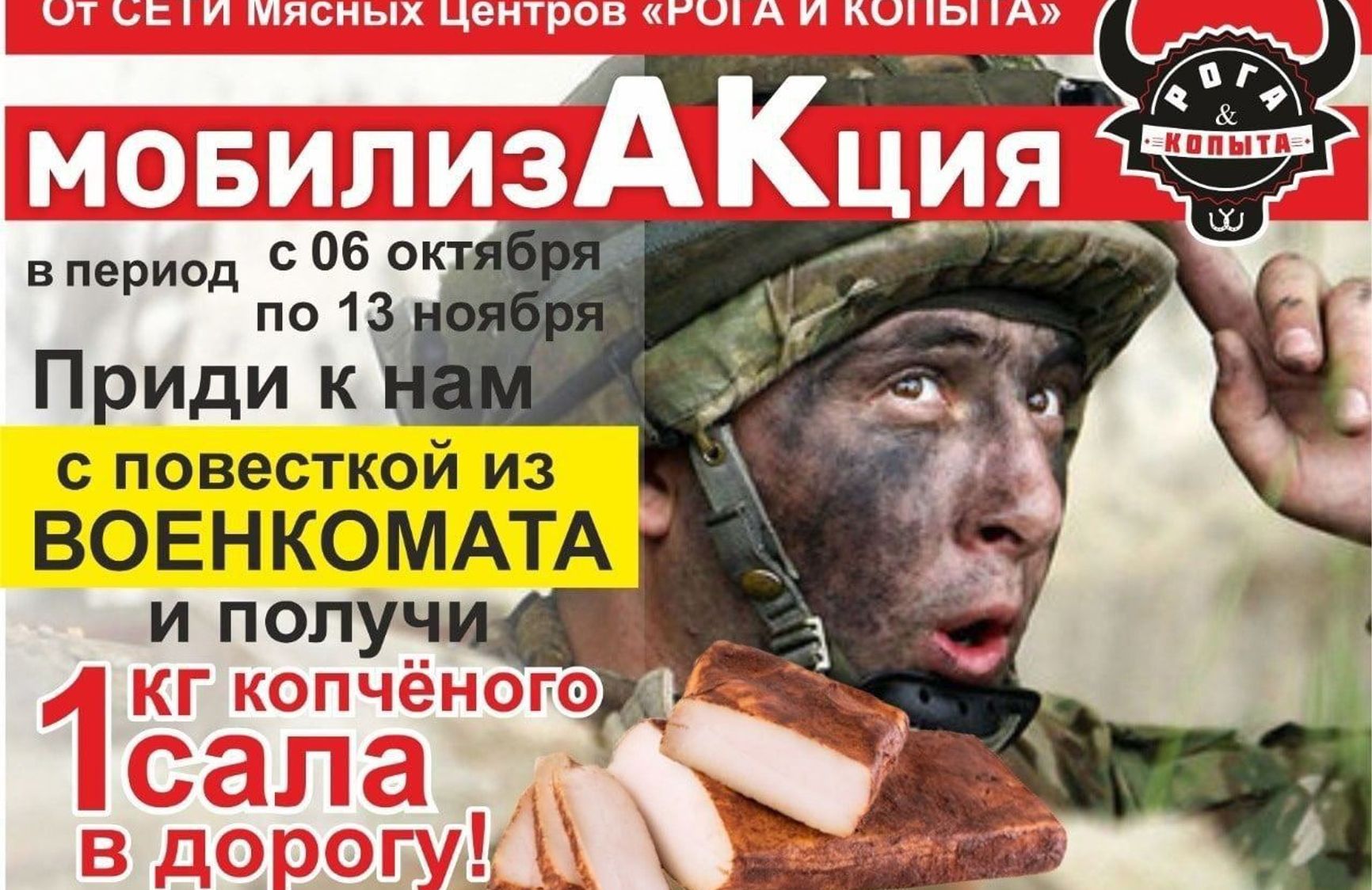 Есть и частные инициативы. Так, в Кургане магазин «Рога и копыта» пообещал мобилизованным «приятный бонус» — там решили раздавать мужчинам «в дорогу» по килограмму копченого сала.