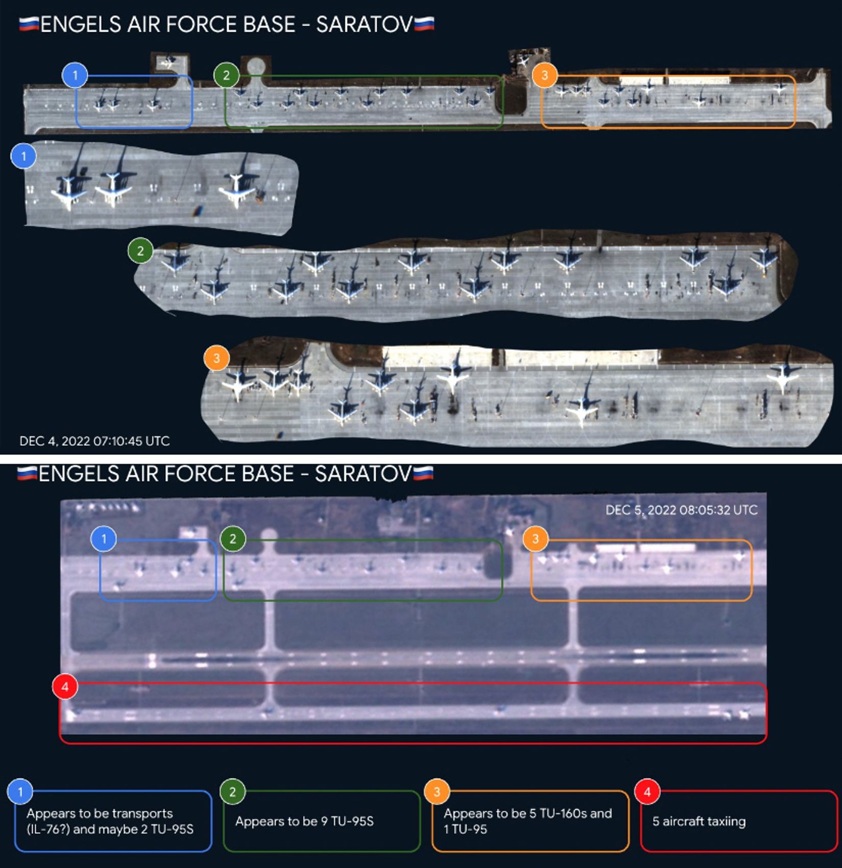 Точные последствия ударов пока неизвестны. В Энгельсе прилет БПЛА, по всей видимости, не имел серьезных последствий. Это следует из сравнения спутниковых снимков аэродрома за 5 декабря после удара и за 4 декабря накануне.