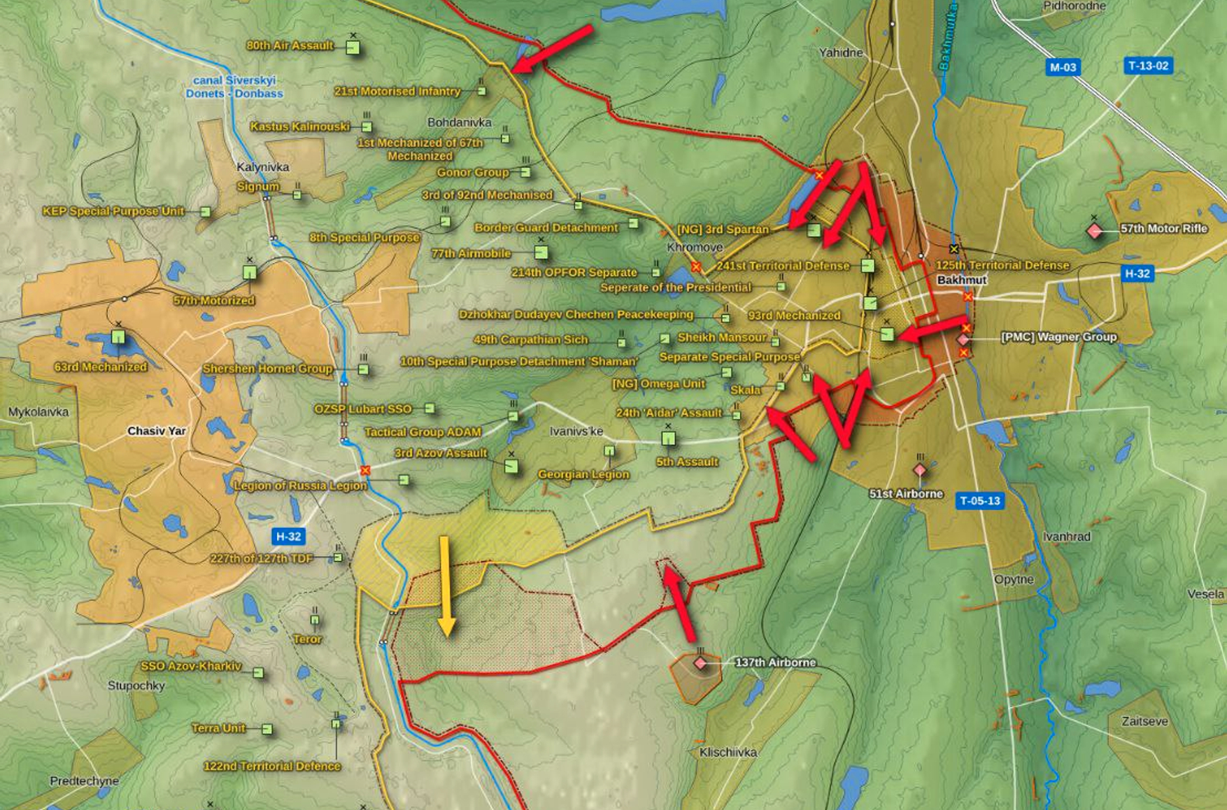 В последние дни россияне усилили натиск на Бахмут. С конца марта 2023 года их продвижение в основном застопорилось, сообщает британская военная разведка. В ежедневном отчете говорится, что Россия добилась новых успехов и теперь с большой вероятностью продвинулась в центр города, а также захватила западный берег реки Бахмутка. Ключевой маршрут снабжения Украины к западу от города, вероятно, находится под серьезной угрозой. Регулярные войска, включая ВДВ, вероятно, прибыли в район, и теперь вся группировка действует более эффективно. Ведомство добавляет, что вполне вероятно «на местном уровне командиры ЧВК Вагнера и российского Минобороны прекратили вражду и укрепили сотрудничество».