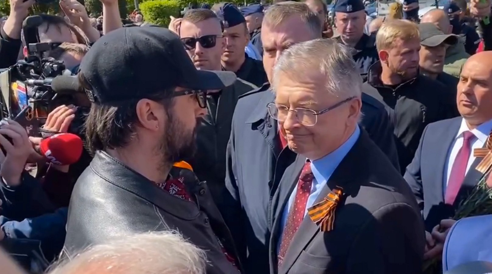 Российский посол в Варшаве Сергей Андреев не смог возложить цветы на мемориальном кладбище советских воинов, поскольку путь ему преградили собравшиеся там люди. На опубликованном видео видно, как Андреева, с георгиевской лентой на пиджаке, окружает толпа, на фоне слышны крики «рашисты».