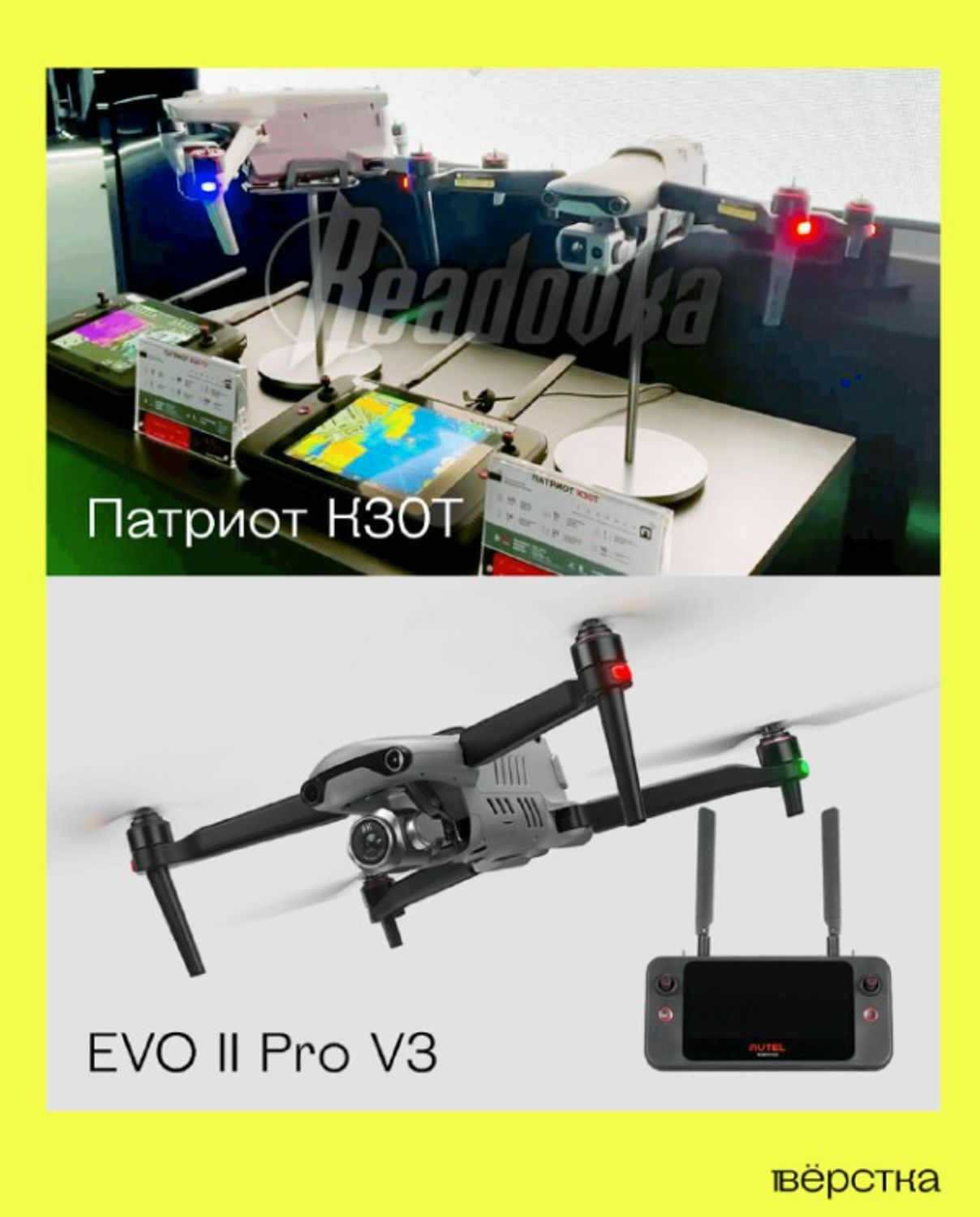 Журналисты «Вёрстки» обратили внимание, что на ПМЭФ показали в числе БПЛА новый дрон «Патриот К30Т», но почти идентичные беспилотники продает китайская компания Autel Robotics. Видео с дроном опубликовал пропагандистский Telegram-канал Readovka, отметив, что он предназначен «для русской армии».