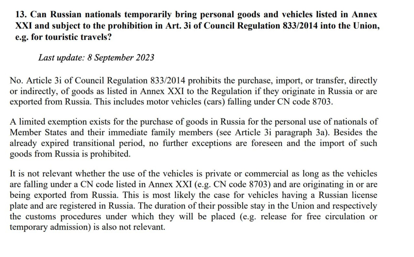 Не имеет значение, являются ли средства передвижения частными или коммерческими, если они относятся к коду 8703, перечисленному в приложении XXI, и имеют российское происхождение или экспортированы из России. Прежде всего это относится к автомобилям с российскими номерами и зарегистрированными в России. Время их пребывания на территории Союза, а также таможенные процедуры, которые они проходят, также нерелевантны.