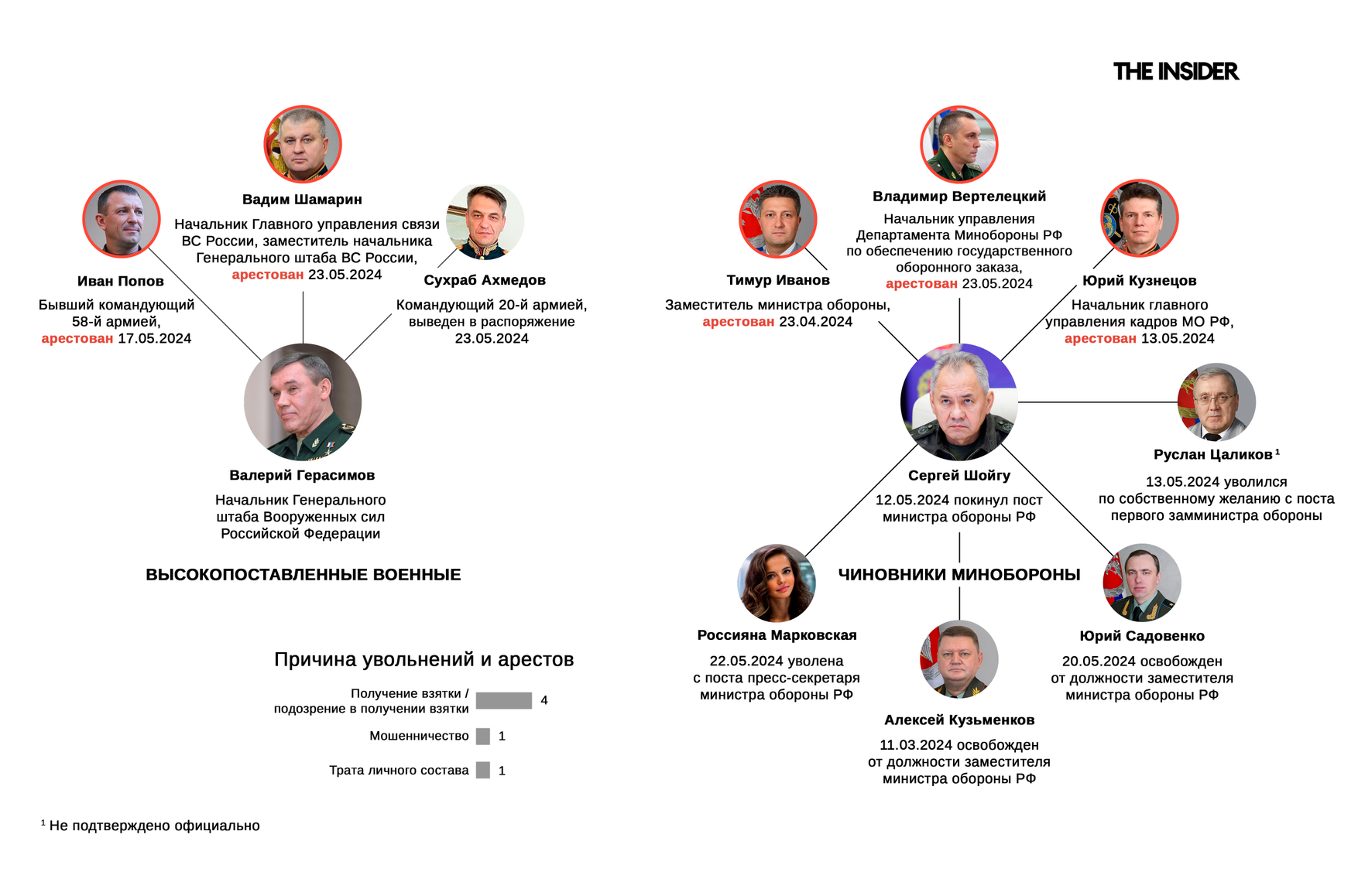 - 20 мая — освобожден от должности заместитель министра МО, генерал-полковник Юрий Садовенко — больше 11 лет руководил аппаратом министра обороны Российской Федерации. Был ближайшим соратником Сергея Шойгу — работал под его руководством с 2002 по 2024 год. Переведен на должность аудитора Счетной палаты.