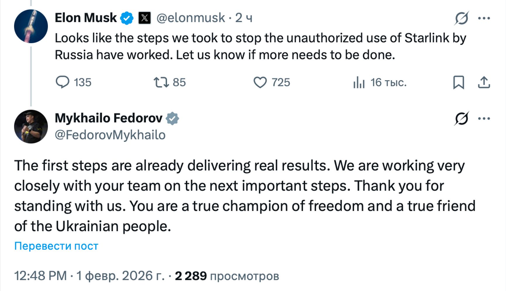 «Похоже, предпринятые нами шаги по пресечению несанкционированного использования Starlink Россией принесли свои плоды. Сообщите нам, если потребуется принять дополнительные меры», — написал Маск 1 февраля, отвечая на твиты Фёдорова с описанием проблемы, опубликованные 29 января. В ответ министр обороны написал: «Первые шаги уже приносят реальные результаты. Мы тесно сотрудничаем с вашей командой, работая над следующими важными шагами. Спасибо за поддержку. Вы — настоящий борец за свободу и верный друг украинского народа».