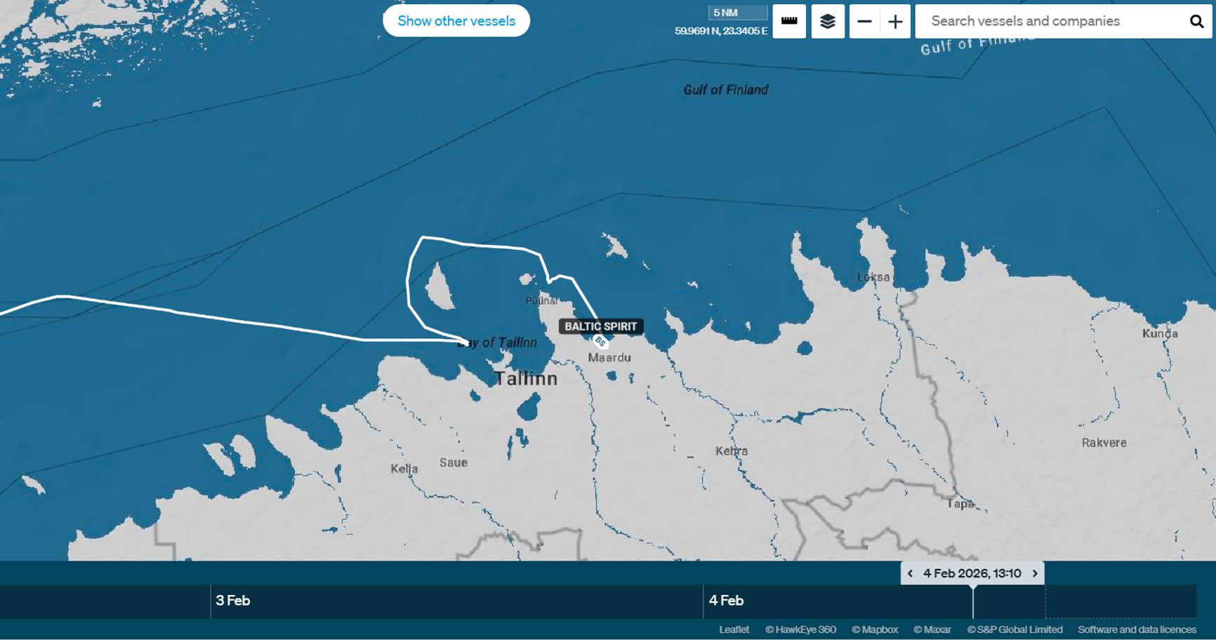 Baltic Spirit был задержан накануне около пяти вечера возле острова Найссаар (рядом с Таллином). На тот момент он стоял на официальной якорной стоянке для бункеровки — заправки топливом. Согласно данным сервиса Starboard Maritime Intelligence, изученным The Insider, судно простояло на одном месте около 15 часов и утром 4 февраля оно обогнуло остров и к часу дня зашло в порт Мууга неподалеку от места задержания.