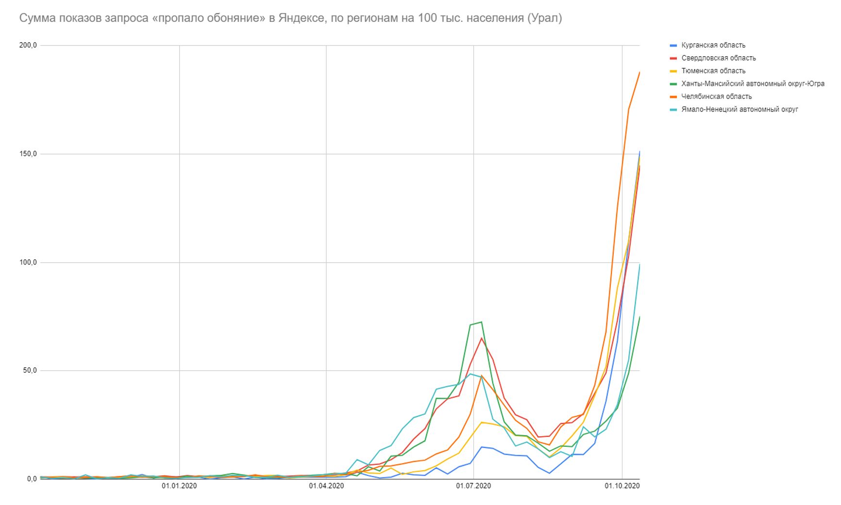Все регионы накрыло второй волной. И везде, кроме ХМАО, превышение относительно летнего пика минимум вдвое (ХМАО добрался до июльского уровня).