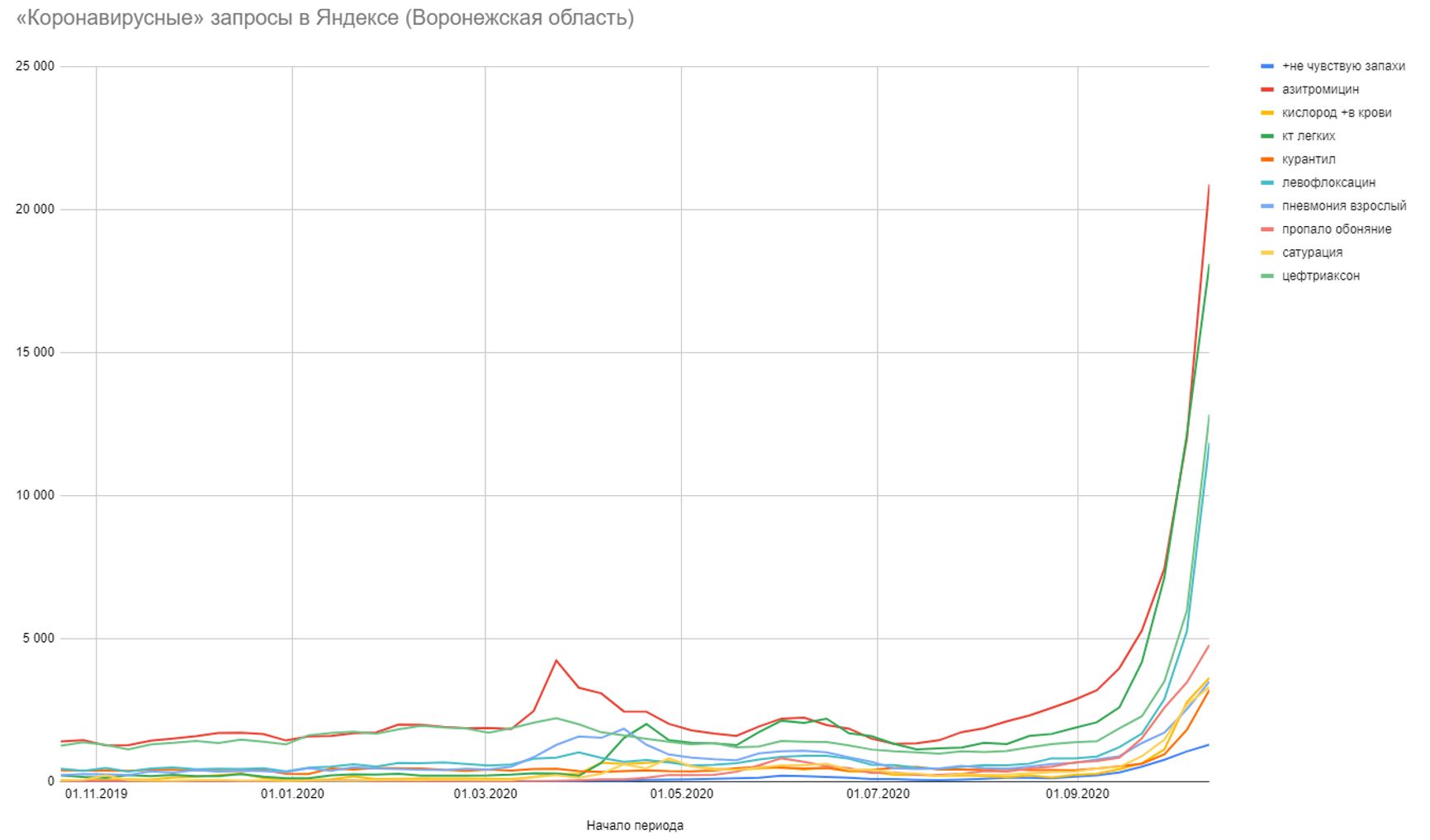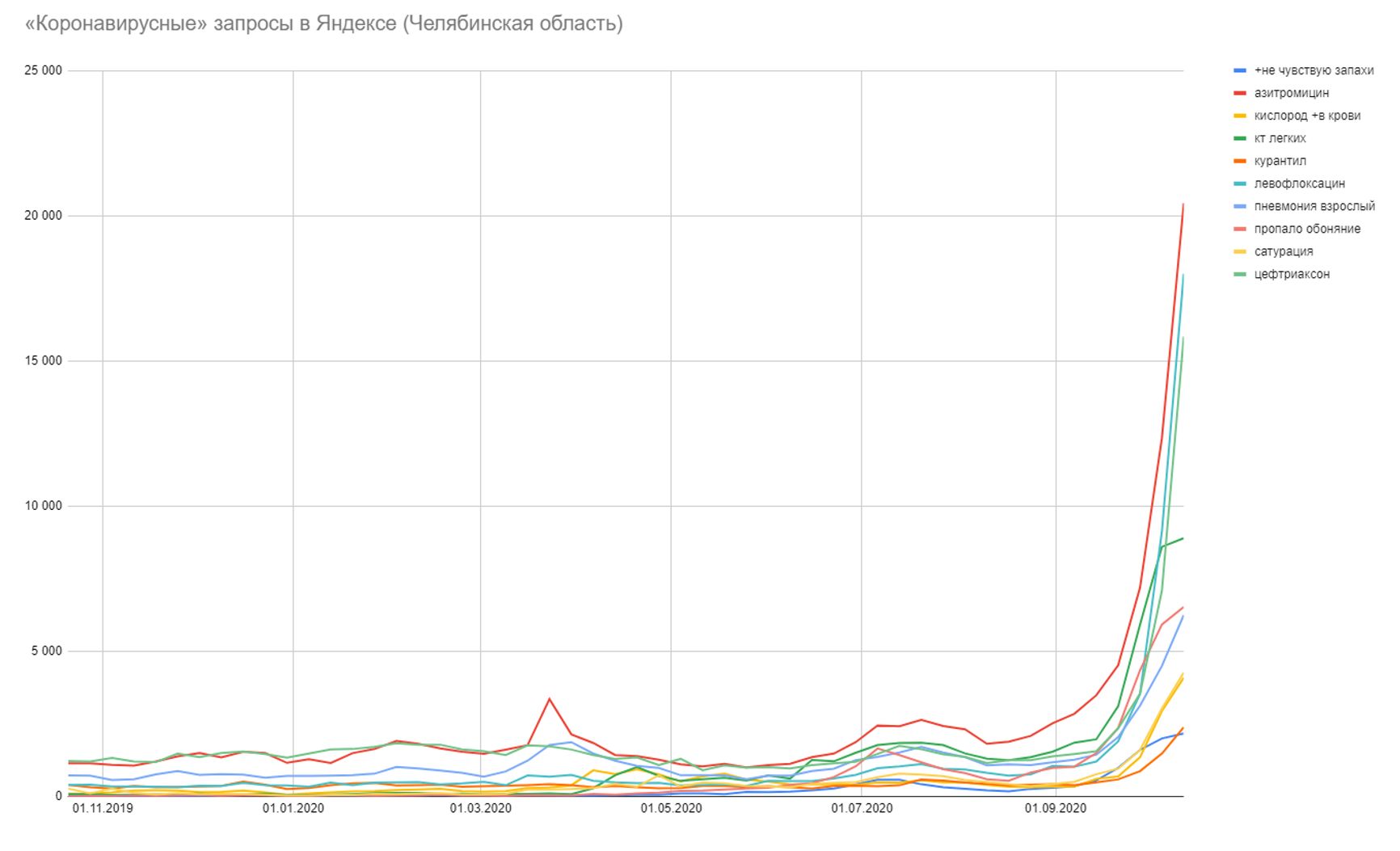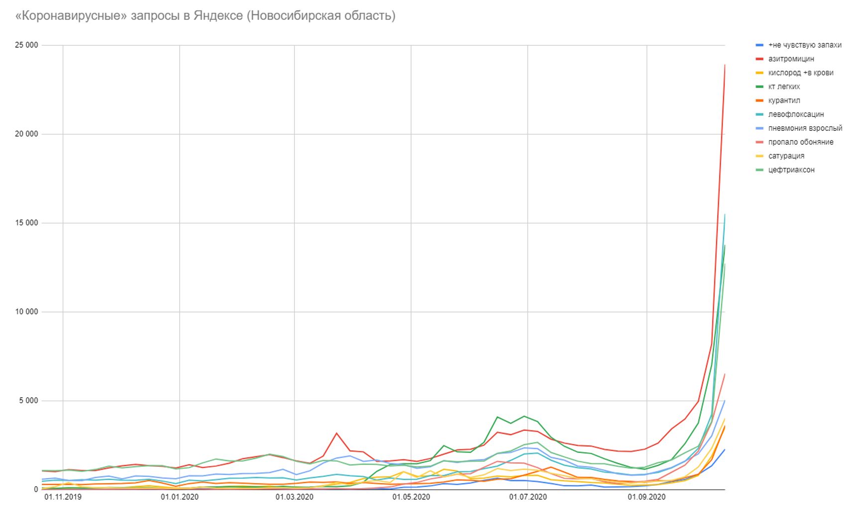 «Пропало обоняние» — запрос не медийный: его популярность не зависит от активности СМИ, и он растёт непрерывно на протяжении 2 месяцев — тогда как медийные запросы дают разовый пик, который за одну-две недели спадает. Кроме него, растут и другие специфические запросы, и коэффициент корреляции этих запросов с «пропало обоняние» — от 0,9 до 0,995. И у всех — общий тренд.