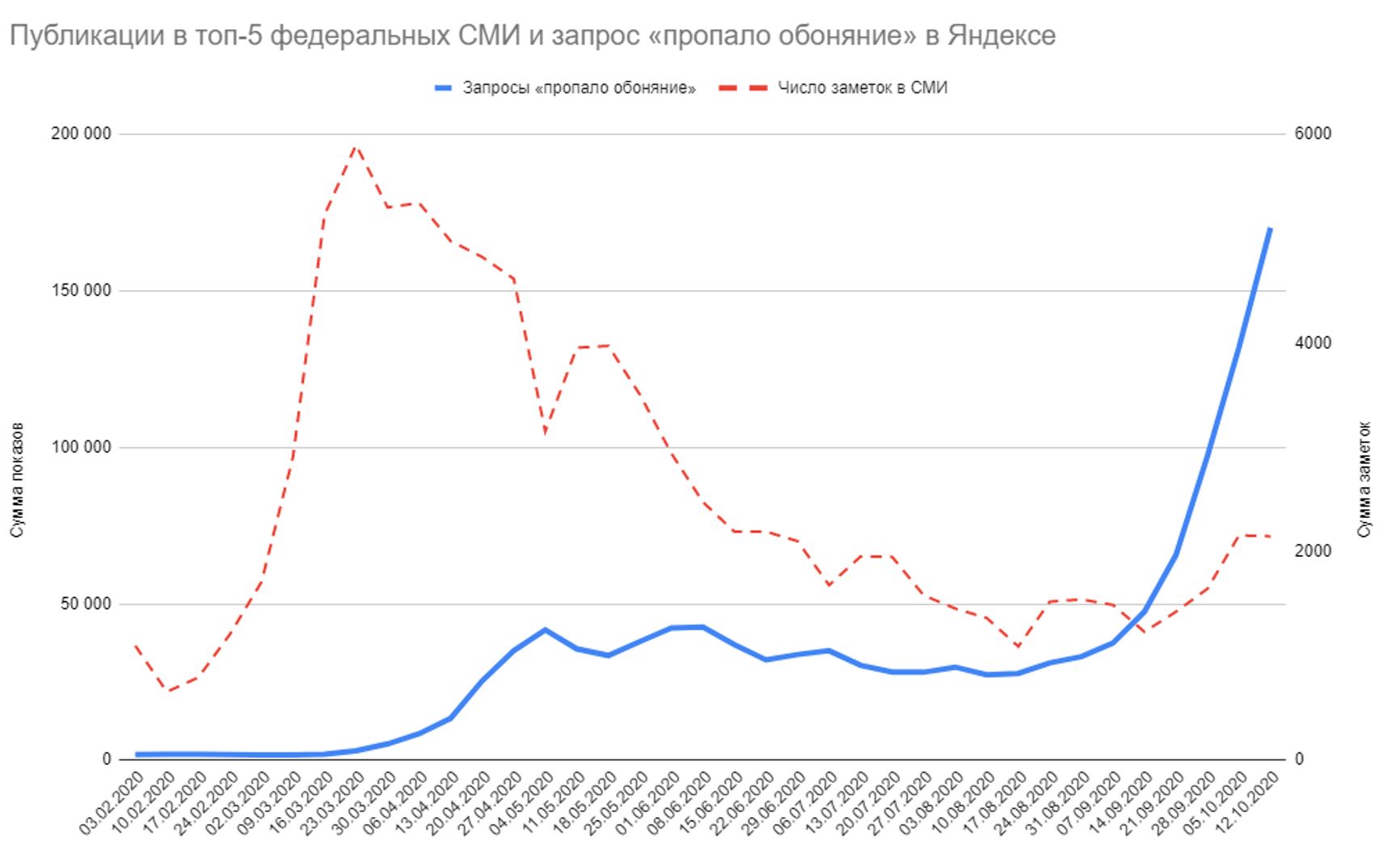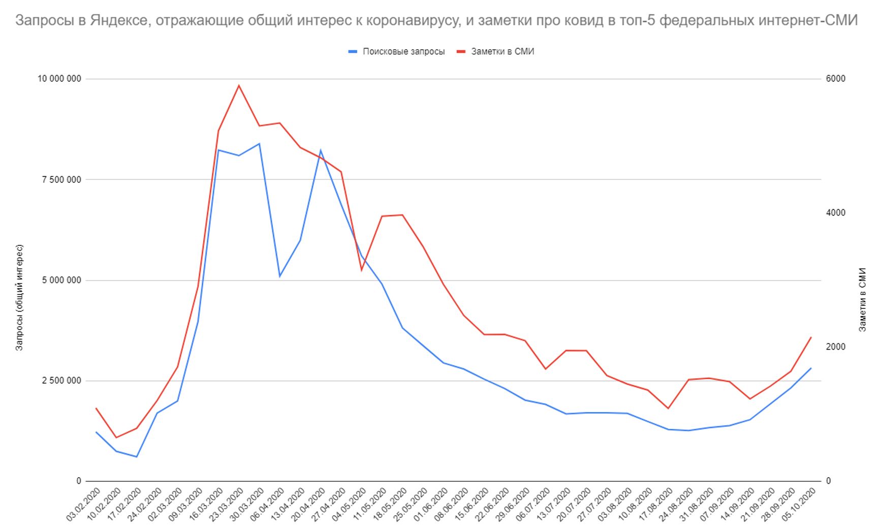 А так коррелирует число заметок в СМИ с запросами со словом «коронавирус»: