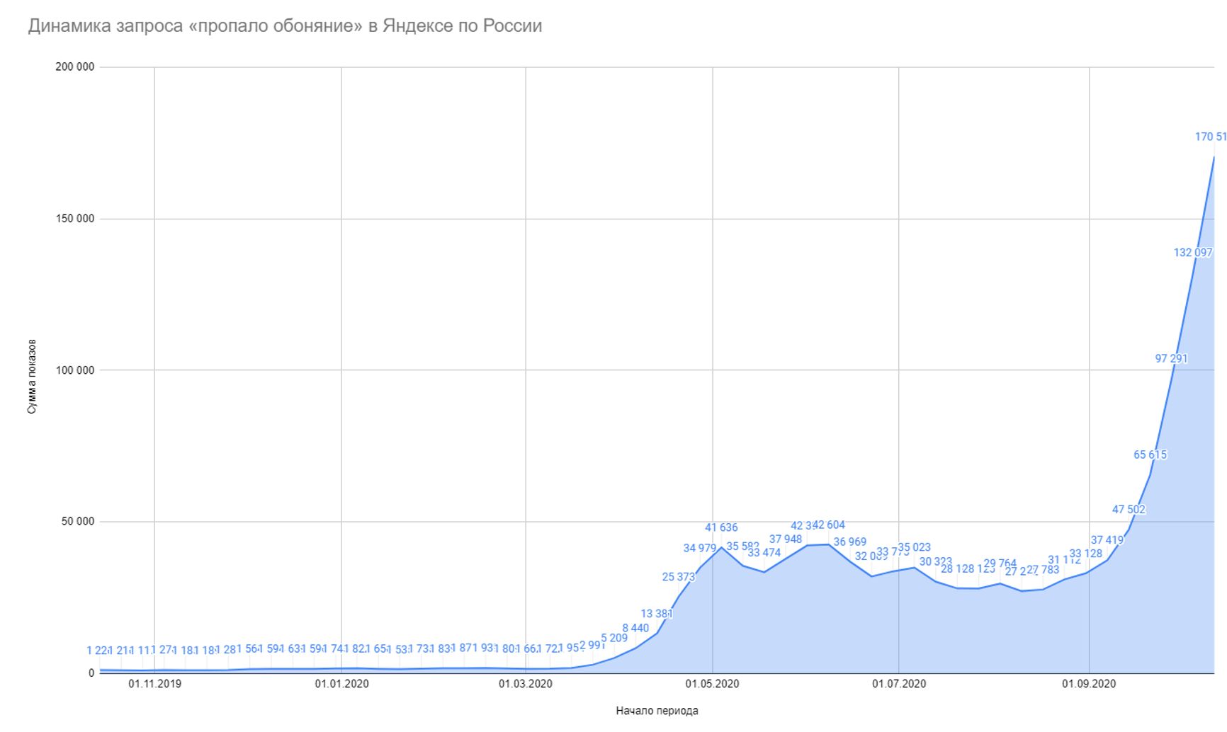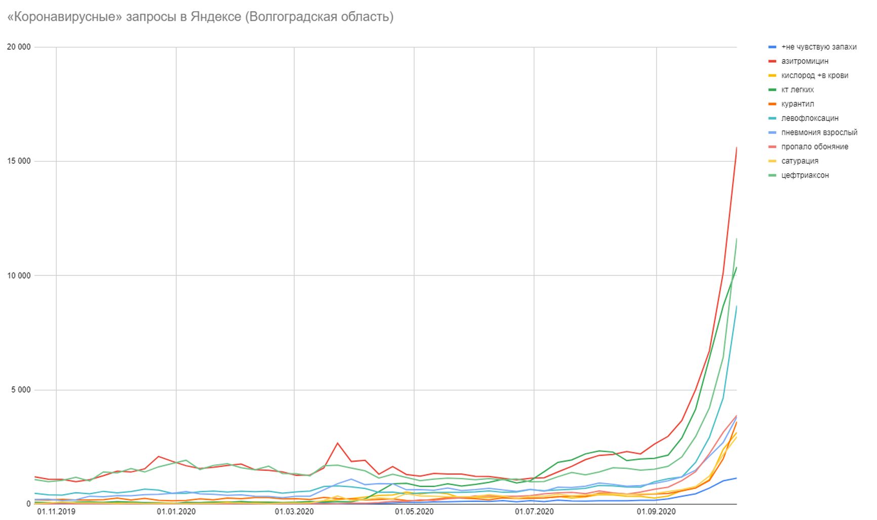 На этом можно остановиться и зафиксировать: по-видимому, специфические поисковые запросы в Яндексе отражают реальную ситуацию с эпидемией, и с лета и первого подхода к теме стало только больше данных, которые это подтверждают. И за последний месяц такие запросы стремительно выросли по всей России. Если месяц назад Вордстат фиксировал 37 тысяч показов, то сегодня — уже 170 тысяч показов в неделю только для одного запроса «пропало обоняние». Рост за месяц — в 3,5 раза, и с каждой неделей такие запросы прирастают на 30−40%.