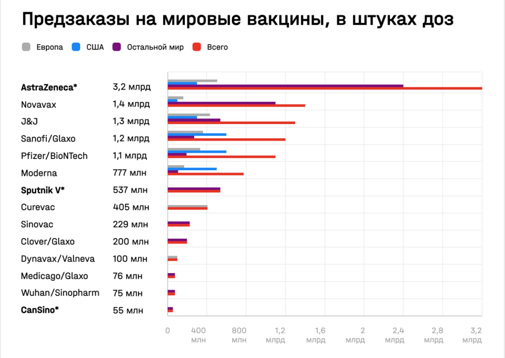 Ожидается, что на территории России будет налажено массовое производство модифицированной вакцины. Ее поставки наладят в 30 стран мира, сообщала «Р-Фарм», и только часть вакцин пойдет на российский рынок. Еще в ноябре все крупные производители вакцин начали собирать предзаказы. По данным Bloomberg, AstraZeneca еще в ноябре стала лидером и заключила контракты на поставки 3,2 млрд доз. Теперь выполнять эти обязательства фирма намерена за счет производства вакцин в разных странах, в том числе и в России.