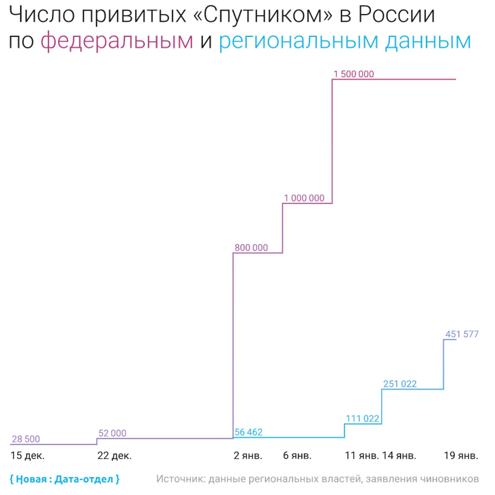 В России ситуация не до конца ясна. На 24 января сообщается о том, что выпущено около 7,5 млн доз вакцины, а по другим источникам – более 1,6 млн доз (на 20 января). Заявления об общем количестве вакцинированных противоречат региональным данным. Так, 11 января сообщалось о 1,5 млн вакцинированных, тогда как по данным региональных властей на 19-26 января - чуть более 750 тысяч.