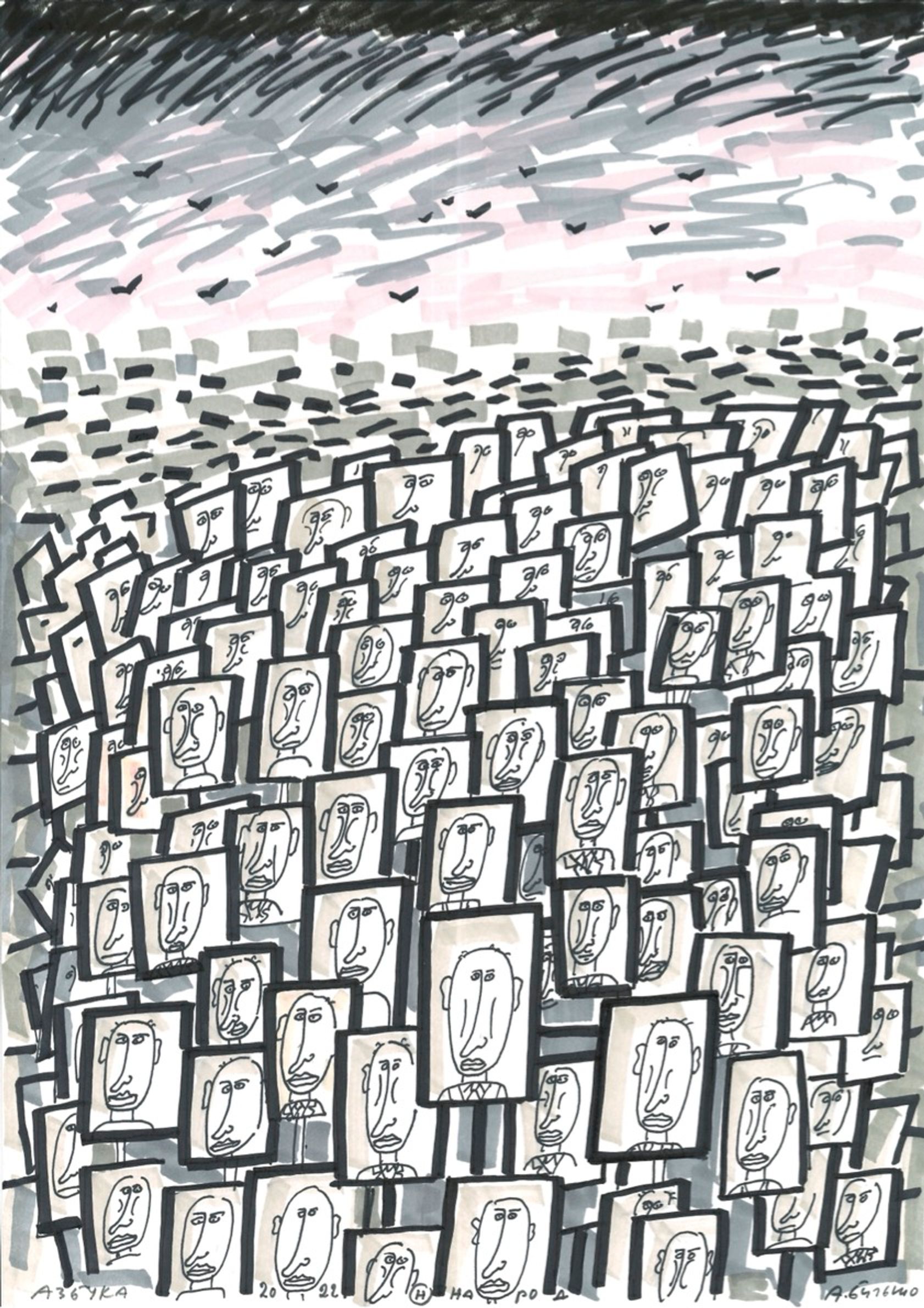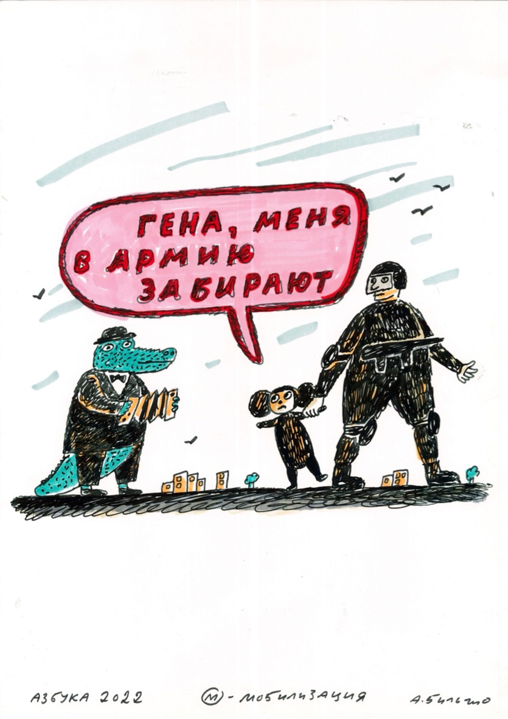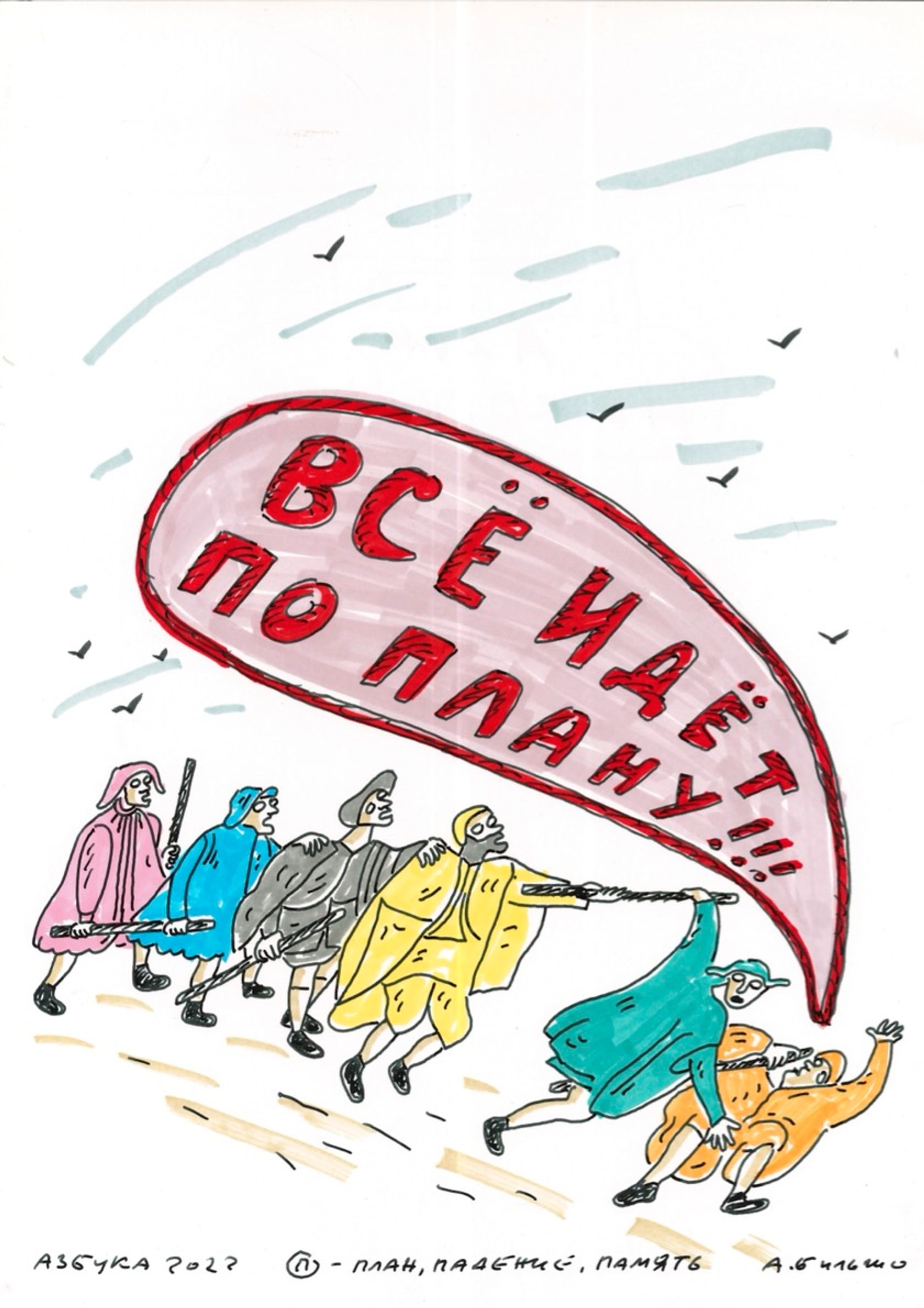На выставке в рамках форума «СЛОВОНОВО» в Черногории художник Андрей Бильжо представил новый цикл «Азбука — 2022» — антивоенный и антитиранический эпос, по буквам передающий весь пафос происходящего. The Insider публикует продолжение цикла.
