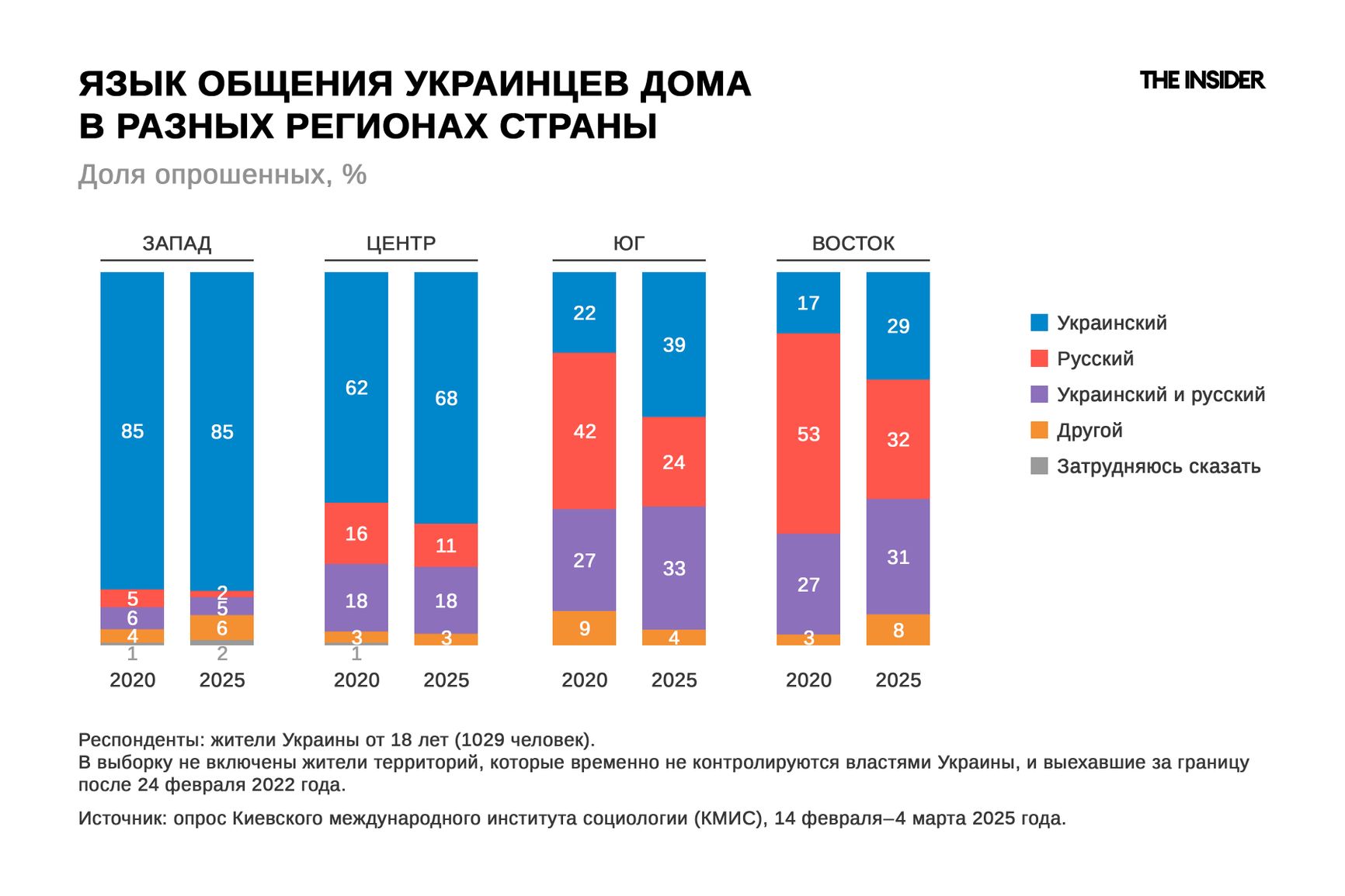 Если в 2020-м году 42% жителей юга Украины общались дома только на русском языке, то в 2025-м таких осталось всего 24%. На востоке этот показатель вообще снизился с 53% до 32%. При этом количество двуязычных увеличилось с 27% до 33% на юге и с 27% до 31% — на востоке. По словам политолога Владимира Фесенко, процесс национальной самоидентификации в Южной и Восточной Украине особенно усилился: многие перешли на украинский именно по политическим мотивам.