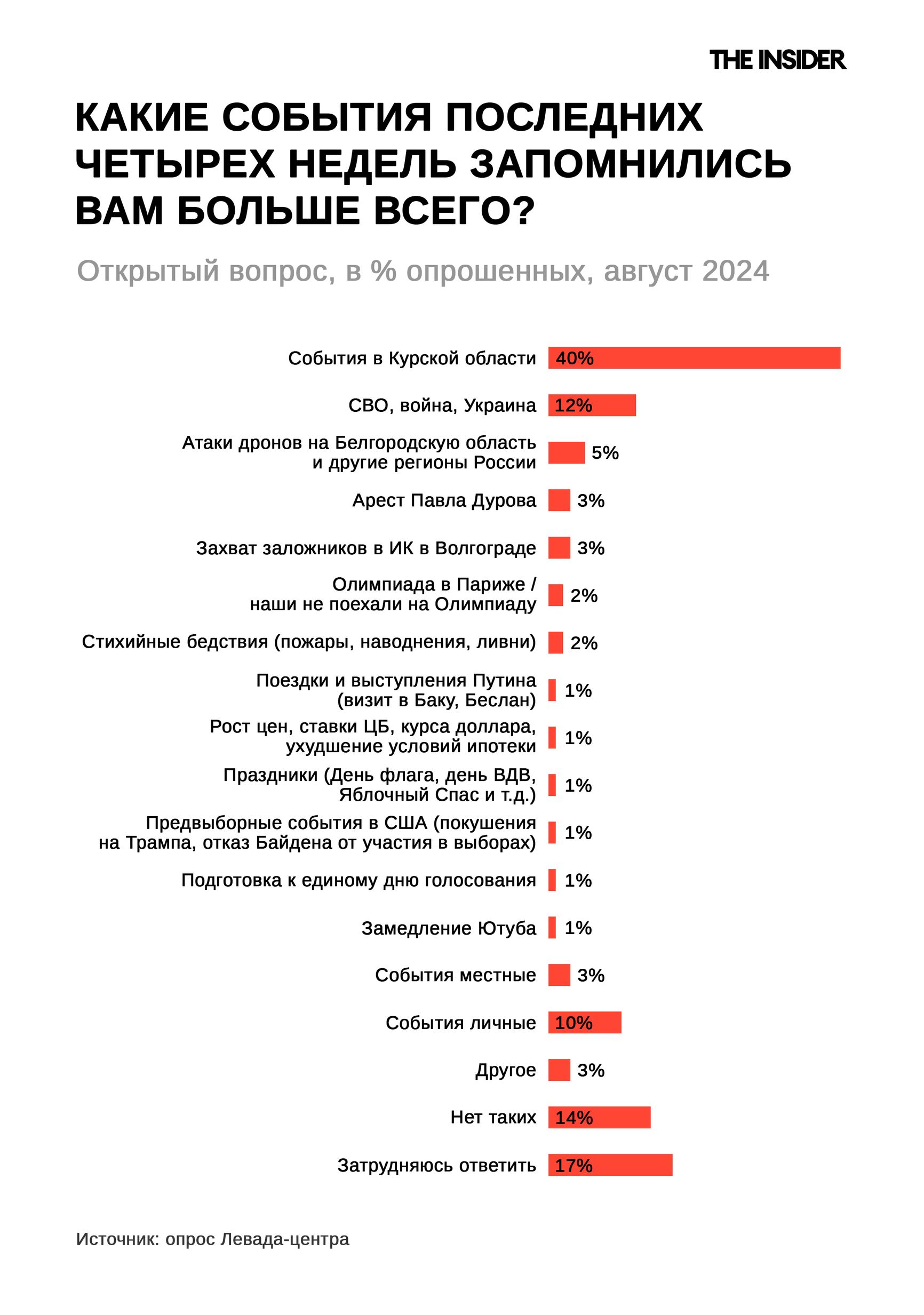 У «Левады» в рейтинге событий августа Курск на первом месте с 40%, а «СВО» (война, Украина) в целом — 12%. Данные за сентябрь еще не опубликованы.