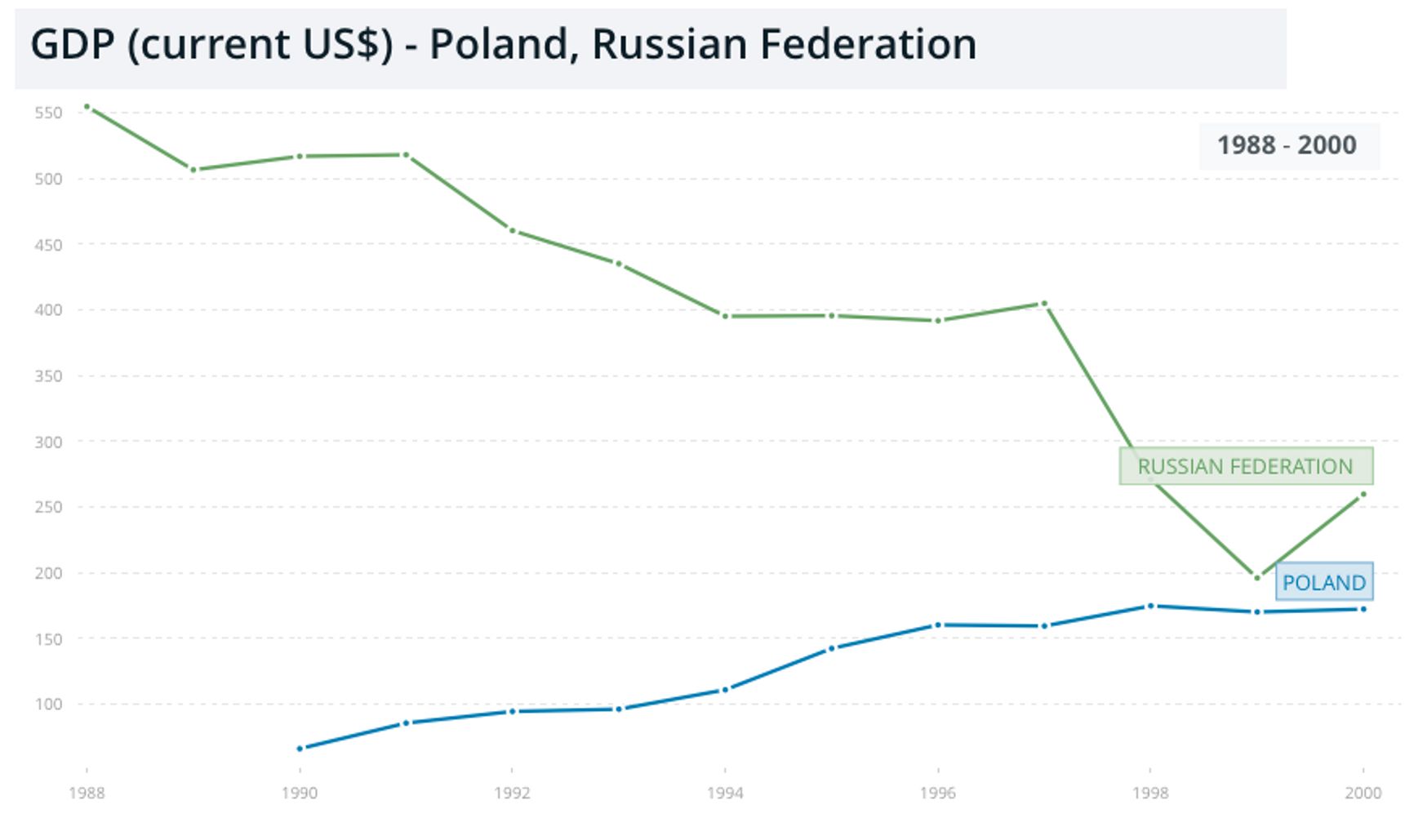 Но платой за все это был слишком долгий путь к росту - свет в конце тоннеля забрезжил только в 1997 году, когда впервые после распада СССР вырос ВВП, - на 6% выросли реальные доходы граждан, удалось прибить галопирующую инфляцию. Сработала политика финансовой стабилизации, как-то двигалась вперед реформа предприятий - к 1999 году, когда началось непрерывное десятилетие экономического роста, доля частного сектора в ВВП выросла до 70% (по данным EBRD Transition Report 1999). Слишком тяжелое советское наследие отняло у нас годы выхода из кризиса - в Польше, где такого наследия не было и у населения были навыки предпринимательской активности, не было такого спада, и «шоковая терапия» быстрее принесла плоды.
