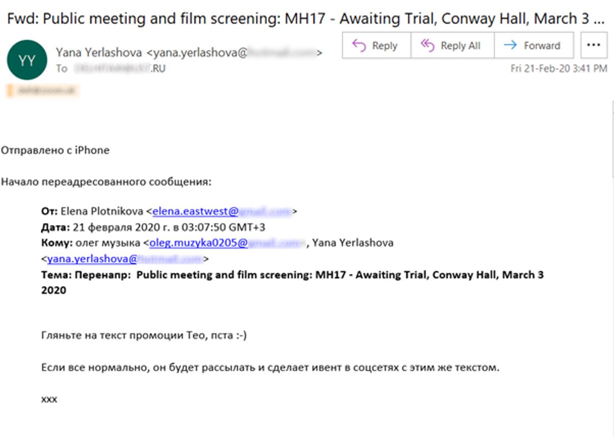 Ему прислали еще неопубликованные черновики статей, предназначенные для публикации на веб-сайте Bonanza Media, а также черновики рекламных материалов для мероприятий с участием Bonanza. В электронном письме от 21 февраля 2020 года Яна Ерлашова направила полковнику Чебанову черновик тизера документального фильма Bonanza, премьера которого была запланирована на 3 марта 2020 года в Лондоне. Тизер, подготовленный британцем Тео Расселом, изначально был отправлен на одобрение помощнице Ерлашовой по СМИ по имени Елена Плотникова. Плотникова — активная сторонница Кремля из Нидерландов и член непрозрачно финансируемой организации под названием «Глобальные права для мирных людей», основная миссия которой, по собственным словам организации, состоит в защите «сепаратистов» на востоке Украины. Через полчаса после того, как Ерлашова получила предложенный рекламный текст, она отправила его — видимо, для утверждения — полковнику ГРУ Чебанову.
