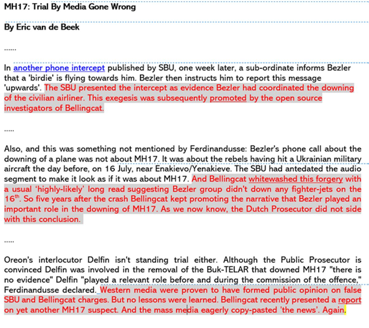 Между копией, представленной Ерлашовой офицеру ГРУ, и опубликованной версией в статью ван де Бека было внесено всего два существенных изменения. Обе эти правки усиливали критику в адрес Bellingcat.