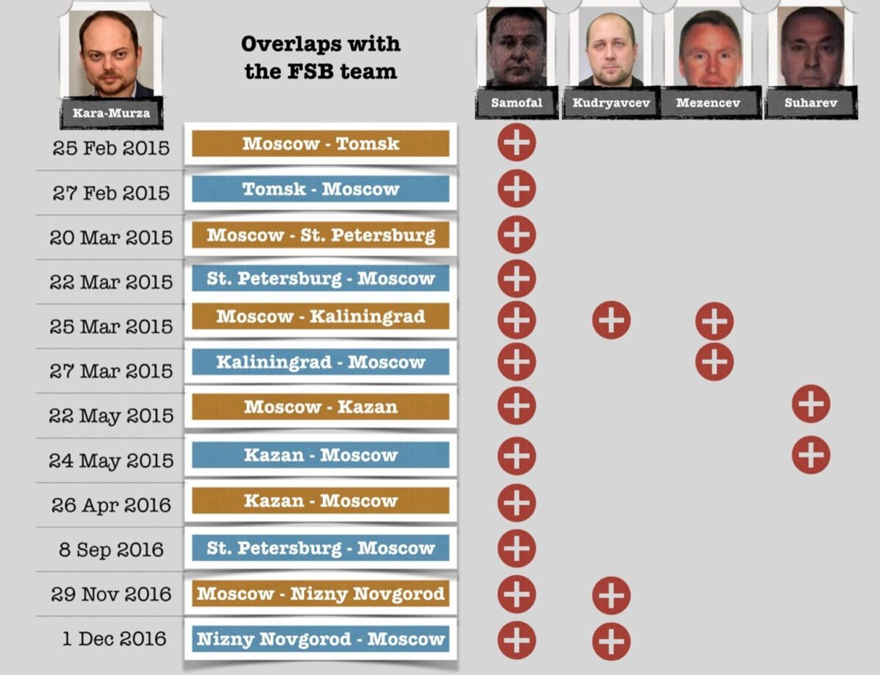 Мы обнаружили, что еще как минимум за три месяца до отравления за Кара-Мурзой начали ездить отравители из ФСБ. Они были с ним в Томске, Санкт-Петербурге, Калининграде и Казани. Причем последняя поездка в Казань закончилась 24 мая 2015 года, то есть менее чем за 48 часов до начала симптомов.