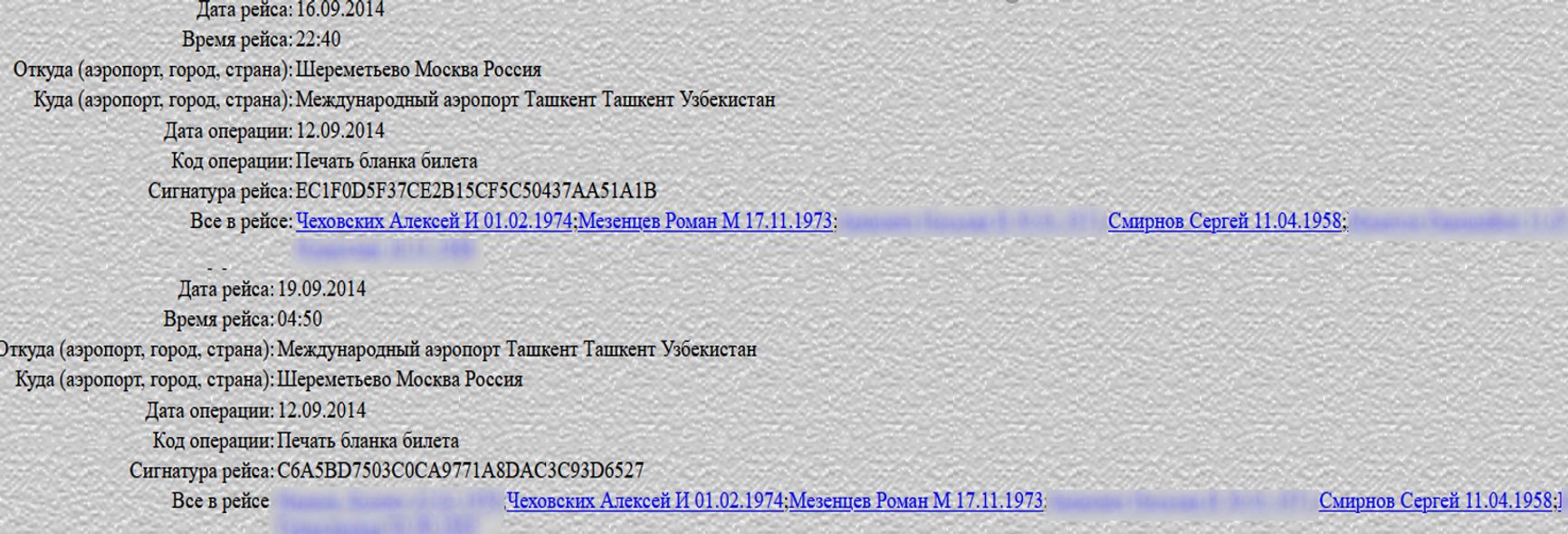 Роман Мезенцев — самый высокопоставленный офицер ФСБ из тех, кто путешествовал в составе бригады отравителей вслед за своими жертвами. Анализ его телефонных звонков, полученных Bellingcat от двух не связанных между собой источников, а также данные о его перелетах показывают, что Мезенцев ежедневно общался и часто ездил с начальником управления 2-й службы Алексеем Жало, а также с другими высокопоставленными чиновниками ФСБ и правительства. К примеру, в сентябре 2014 года он прилетел в Узбекистан вместе с двумя ближайшими заместителями директора ФСБ Александра Бортникова, а именно генералом Сергеем Смирновым и генералом Алексеем Чеховских. Сергей Смирнов был первым заместителем Бортникова и курировал вторую службу до своего выхода на пенсию в октябре 2020 года.