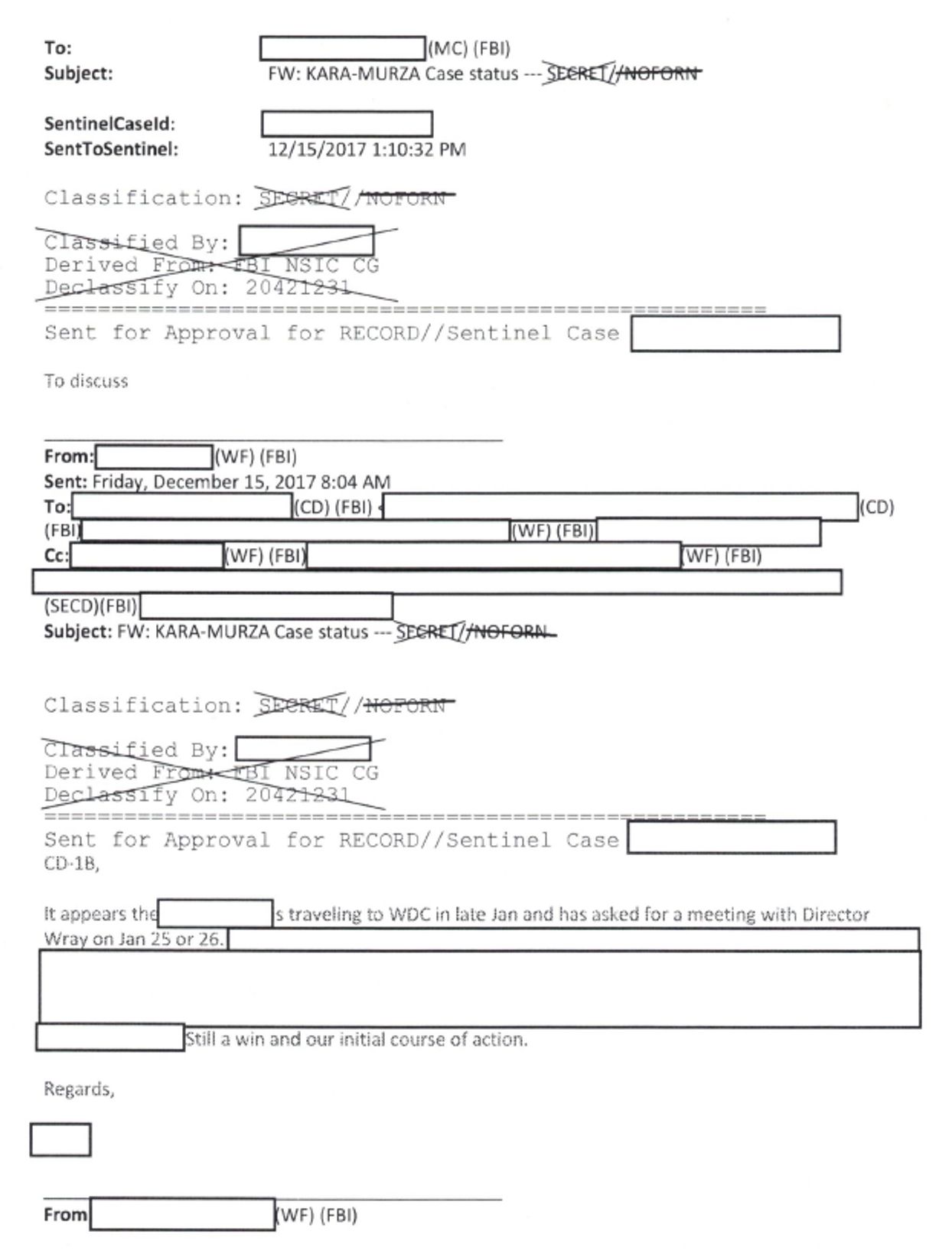 Отчего вдруг такая секретность? Возможно, подсказку можно найти в нескольких десятках все же опубликованных страниц дела. В одном из рассекреченных документов говорится, что в конце января 2018 года в Вашингтон должен прилететь некто (имя скрыто из документа), попросивший о встрече с директором ФБР Кристофером Рэем. Известно, что в период с 21 по 27 января 2018 года в США прилетали три ключевых российских силовика — глава ФСБ Александр Бортников, глава СВР Сергей Нарышкин и глава ГРУ Игорь Коробов. Из них троих именно Бортников более всего подходит по статусу как человек, который мог бы попросить о встрече с главой ФБР. Сам тот факт, что упоминание об этой встрече есть в документах по делу о Кара-Мурзе, говорит о том, что его вопрос обсуждался на встрече. В таком случае отказ от публикации результатов анализов может быть частью какой-то сделки.