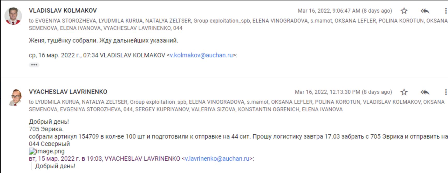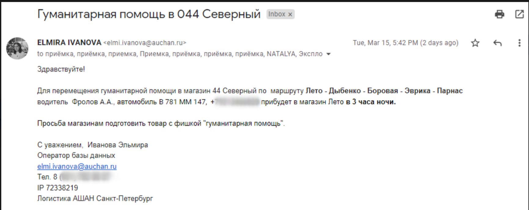 Отдел логистики в лице менеджера по складским операциям Дмитрия И. подтверждает собранное количество и автотранспорт, который ночью 16 марта доставит товары со склада и попутно заберет собранную «гуманитарную помощь» из магазинов «Ашан» Петербурга для перевозки в конечный пункт «Ашан Северный».