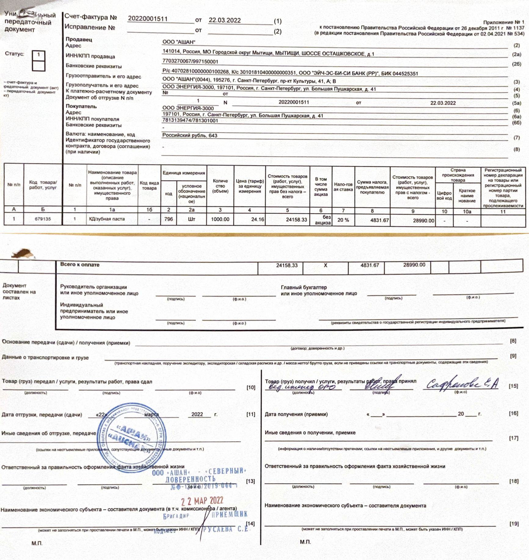 Утром 22 марта 2022 года в «Ашан Северный» приезжает автотранспорт стороннего перевозчика и забирает 4 палета «гуманитарной помощи», в том числе и зубную пасту. За всех десять юрлиц расписывается один человек — «ведущий инженер» Сафронова Е. А.