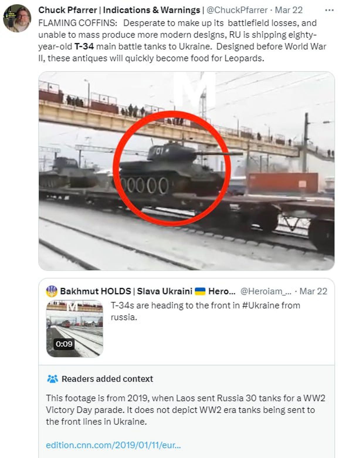 Между тем некоторые аккаунты заявляют, что эти и другие танки Второй мировой действительно едут на фронт. Впрочем, эти сообщения (пока что) оказываются фейками. Так, о поставке Т-34 на фронт в Украине написал американский аналитик Чак Пфаррер. Твит оказался настолько популярным, что модераторам Twitter пришлось добавить к нему опровергающее уточнение. Как выяснилось, опубликованные Пфаррером кадры на самом деле были сняты в 2019 году, когда Россия получила партию исправных Т-34 из Лаоса для участия в парадах.