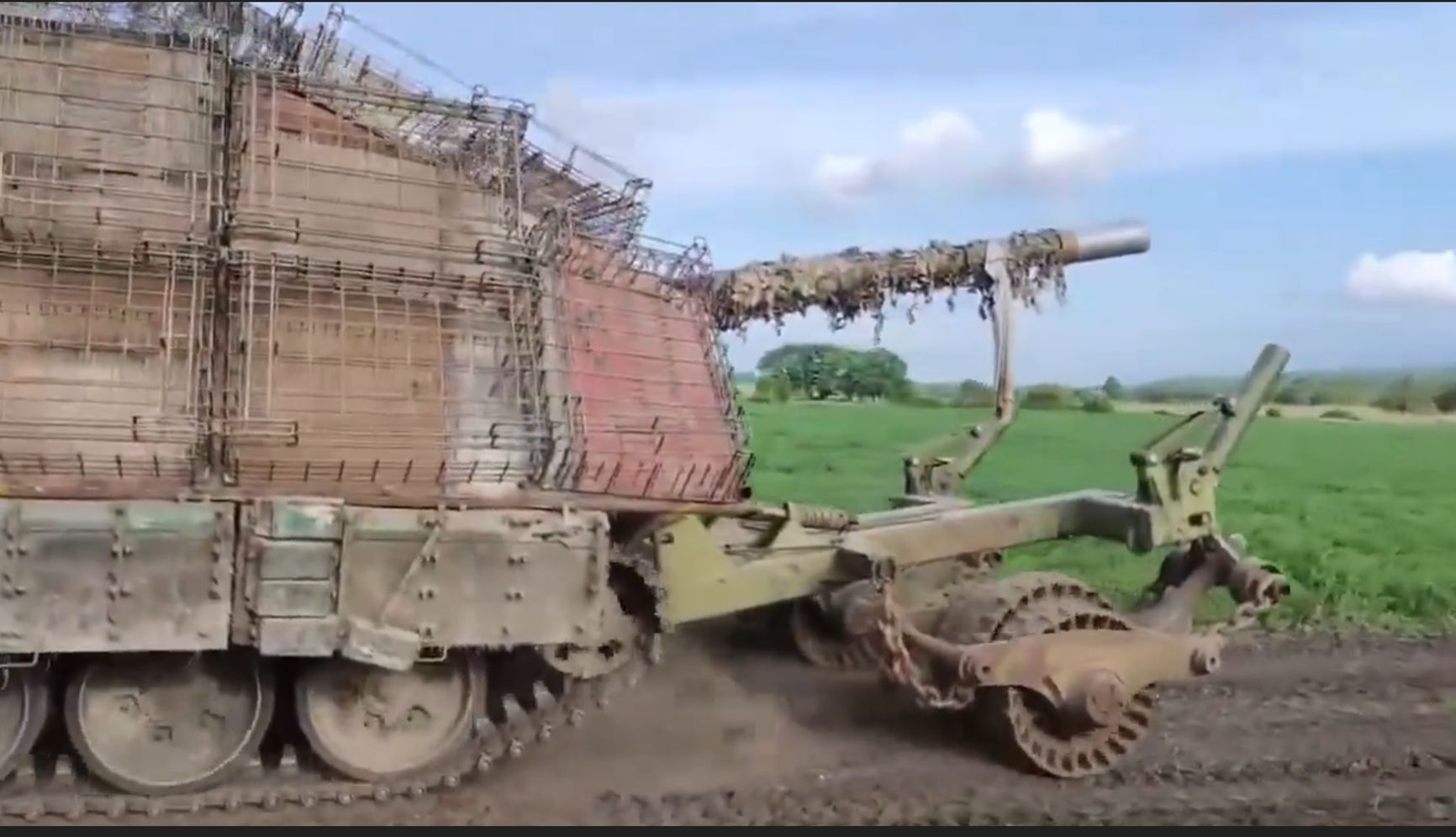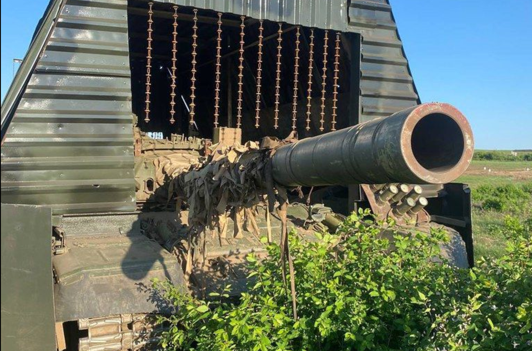 Пассивная защита бронетехники от БПЛА-камикадзе достигла апогея с появлением в рядах российских войск «царь-мангалов» — танков, заключенных в своеобразный кокон из металлических или резиновых листов, часто для надежности прикрытых сверху еще одним слоем противодроновых решеток.