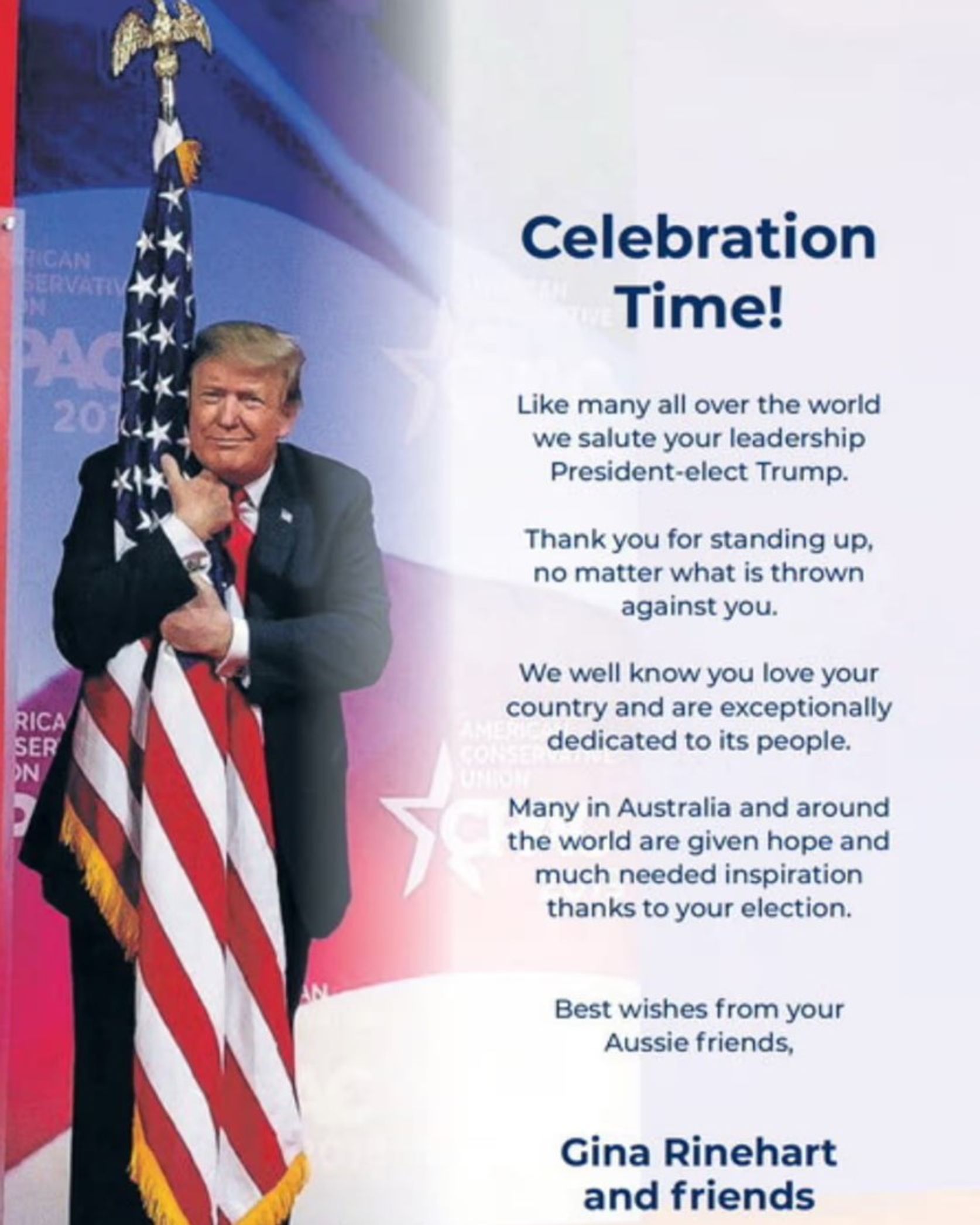 Выдающемуся лидеру, который понимает, что бюрократия, излишнее регулирование и налоги лишь мешают привлечению инвестиций. А инвестиции — ключ к повышению уровня жизни населения. Как и многие по всему миру, мы поздравляем вас, отдаем должное вашему лидерству, уже избранный президент Трамп. Спасибо за вашу стойкость несмотря на все препятствия, которые вам чинят! Мы хорошо знаем, как вы любите свою страну и преданы ее народу. Многие в Австралии и во всём мире получили надежду и вдохновение благодаря вашей победе на выборах.